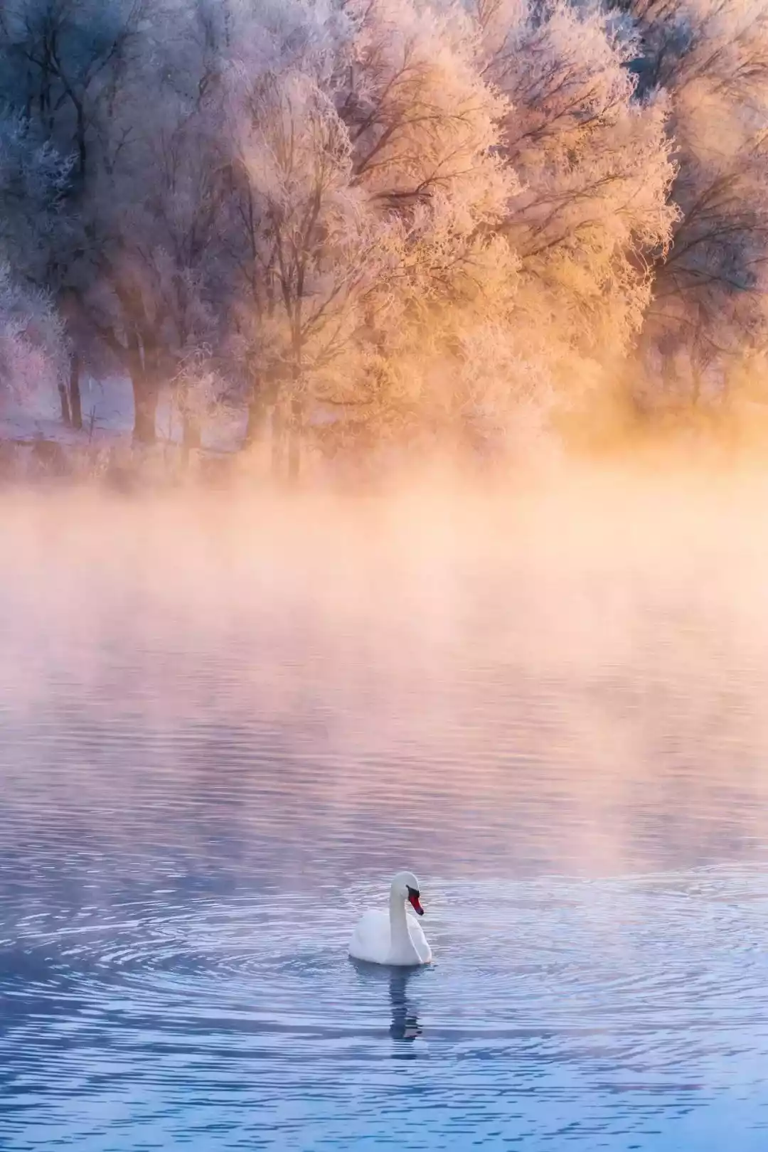 Every morning, the water vapor from the hot spring condenses on the branches, forming crystal rime, and white swans play and frolic in the water, making it look like a fairyland on earth.