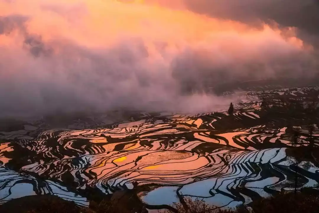The terraced fields on the other side have also entered their watering season. Known as one of the "Seven Greatest Cultural Landscapes of the World," they reach peak beauty from winter to spring, drawing crowds of enthusiasts to witness the dazzling light and stunning sea of clouds.