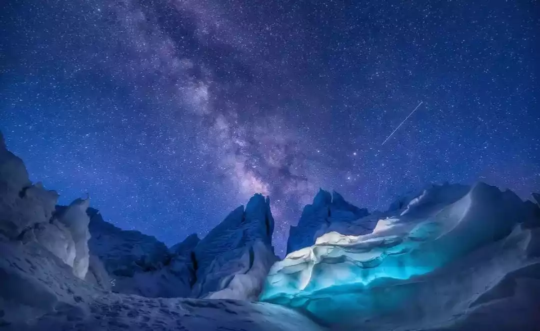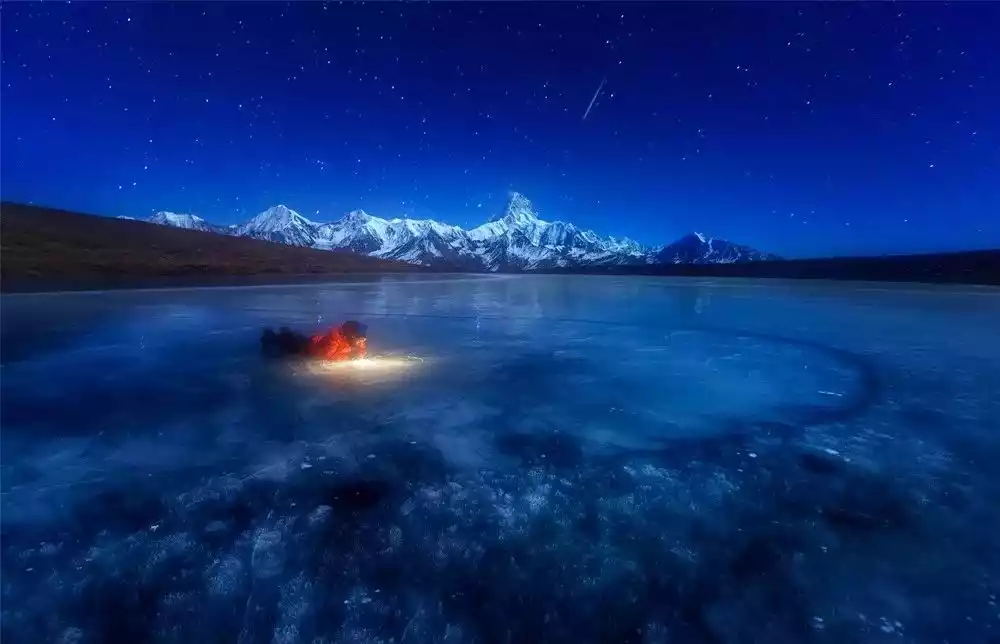 Glacial movement has left countless glacial lakes in western Sichuan. In winter, due to the high altitude and thick ice, the short-wavelength visible light reflected by the lake appears to the human eye as a dazzling and dreamy blue ice.