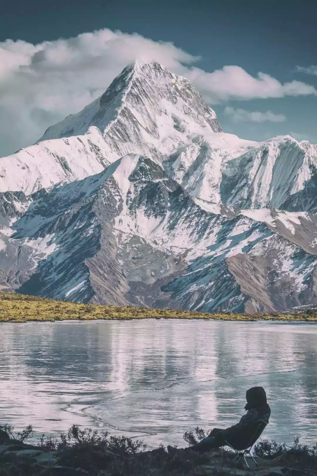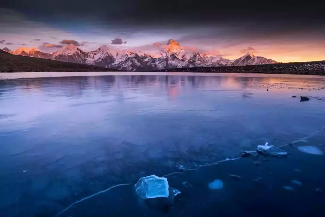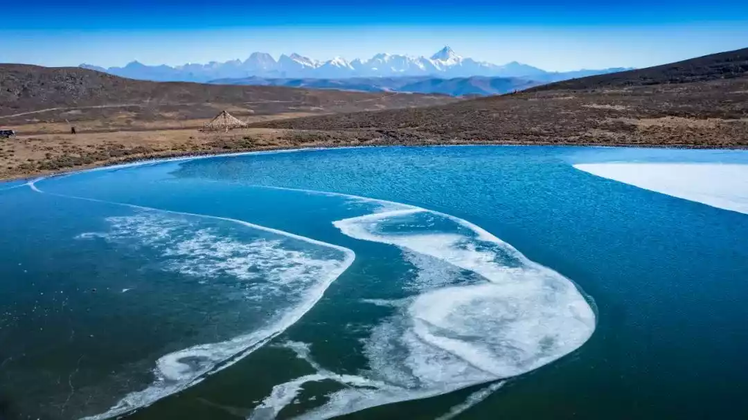 Standing by the lake, the Gongga Snow Mountains are lined up in a row. In December, the ice on the lakeside is seven or eight centimeters thick, enough to support us walking on the ice. The frozen lake surface + the Gongga Mountains, the most beautiful scene of western Sichuan in winter is here!
