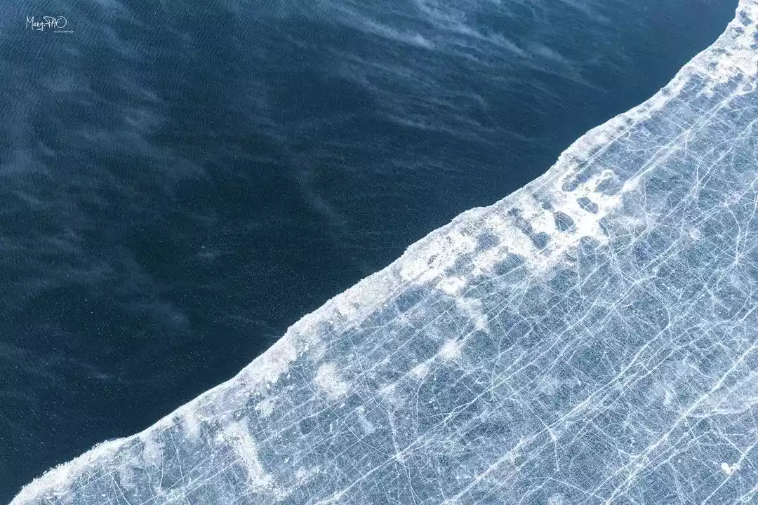 In winter, half of the vast lake is covered with thick ice, and the other half is sparkling water, shining like gold.