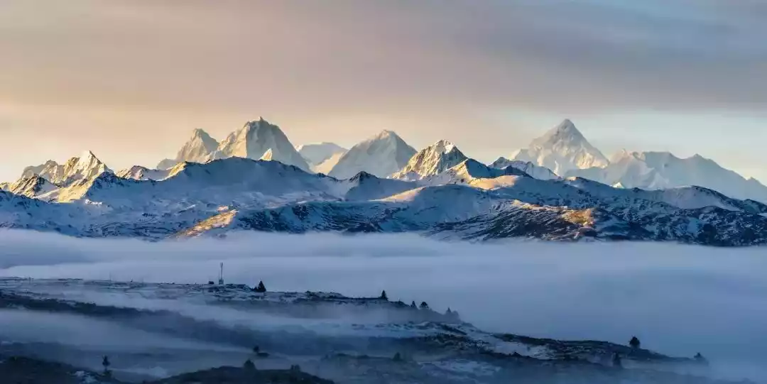 Mount Gongga, known as the "King of Mountains in Shu", has a main peak at an altitude of 7,556 meters. It is surrounded by 45 snow-capped peaks with an altitude of more than 6,000 meters, forming a majestic and magnificent snow-capped mountain group.