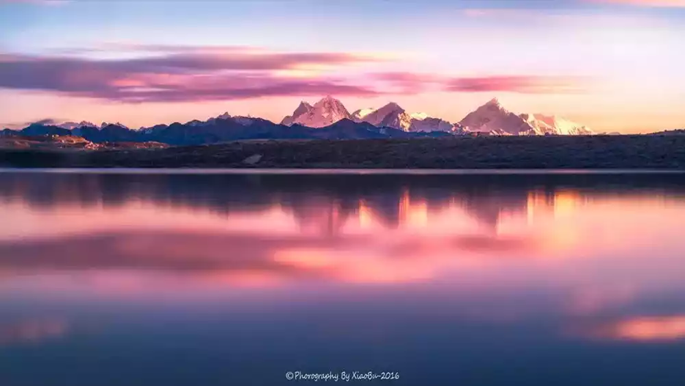 This secret place is located on the huge glacier plain of Gaolusi Mountain on the Qinghai-Tibet Plateau. It has a broad prospect and can take in the entire Great Snow Mountain Range, the reflections of the snow-capped mountains along the line of Jiazi Peak and Gongga Main Peak.