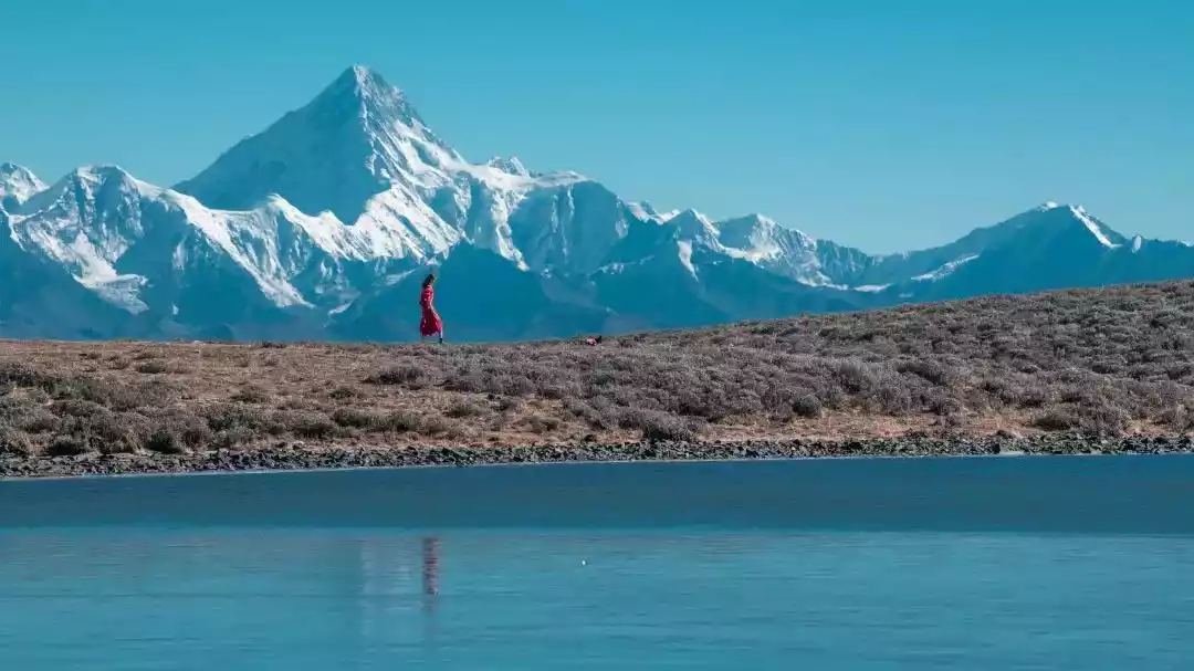 Honghaizi Lake is 4,200 meters above sea level, located in the upper reaches of Mugecuo Lake, facing Bijia Mountain, and connected to Mugecuo Lake by a small river. The snow that never melts all year round forms its beautiful background.