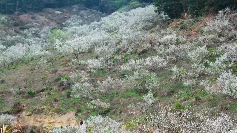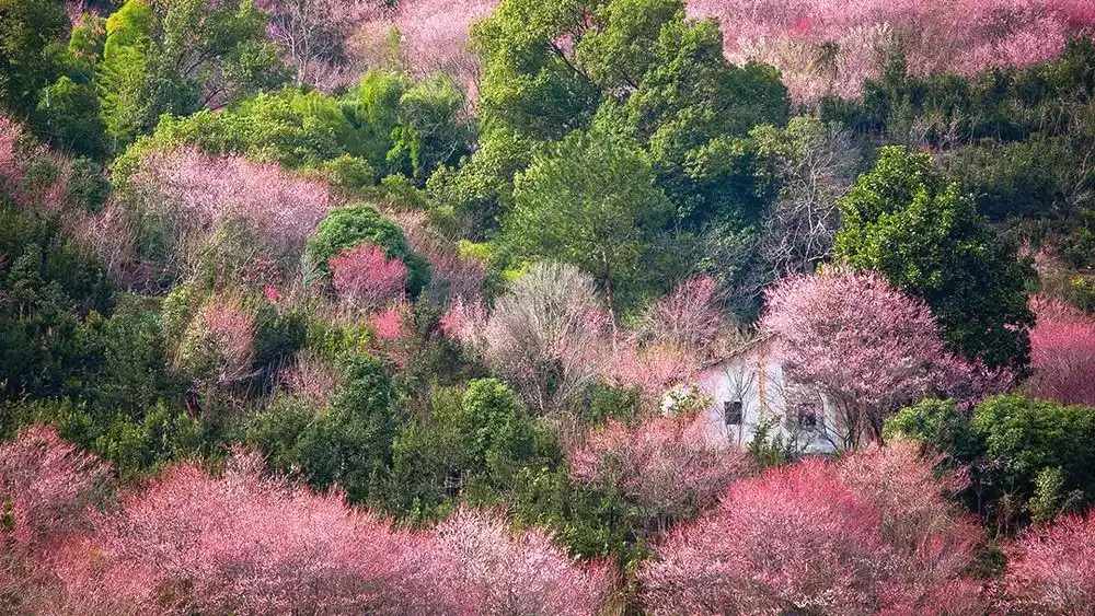 In early February, spring arrives before the arrival of plum blossoms on Heming Mountain. Their pink and white blossoms paint the entire mountain landscape. Strolling through the sea of plum blossoms, the occasional breeze creates a romantic scene of plum blossom snow.