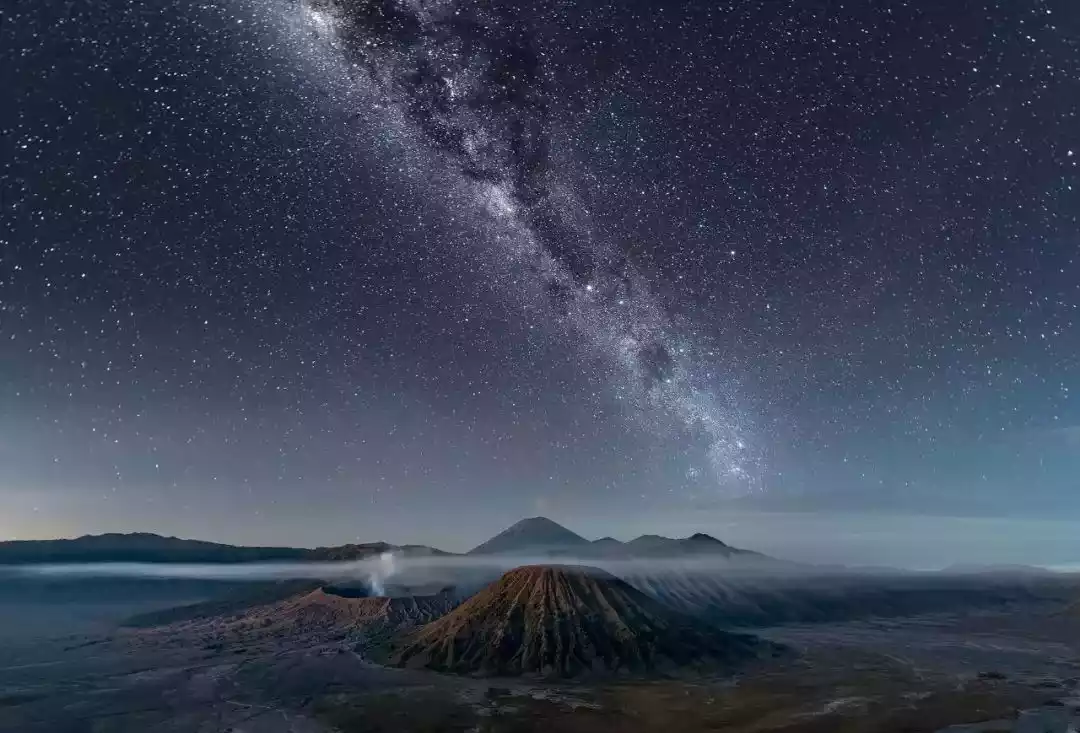 Mount Bromo under the starry sky at night is as quiet and lonely as the surface of the moon.