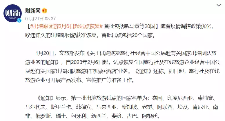 The most exciting thing is that! After much anticipation, the "group restriction order" for outbound travel has finally been lifted. Outbound group tours will resume on a pilot basis starting February 6th, marking the long-awaited return of outbound group tourism to normal.
