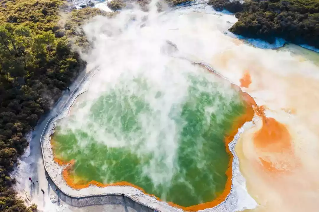 Go to the "Yellowstone Park" in the southern hemisphere, fly a drone over the Champagne Pools Geothermal Park, and overlook the steaming "hot spring palette" from a God's perspective.