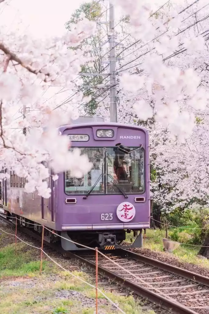 Go to Kyoto, take the Arashiyama train through the pink cherry blossom tunnel, and leave your own postcard.