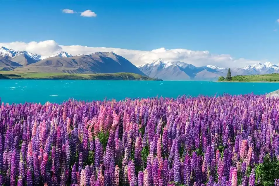 Go to Lake Tekapo, the largest freshwater lake in Oceania, and enjoy the blooming lupines.
