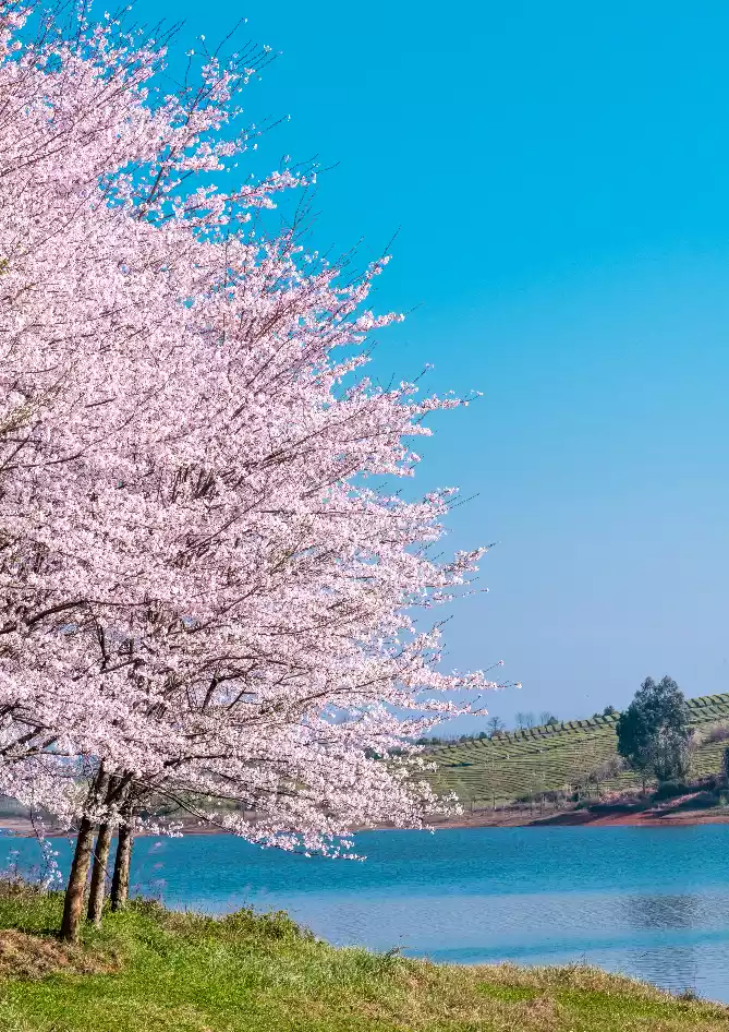 When you come here, you won’t just be here to see the cherry blossoms. There are also more than 2,000 acres of tea fields and more than 3,000 acres of peach blossoms waiting for you to see their beauty!