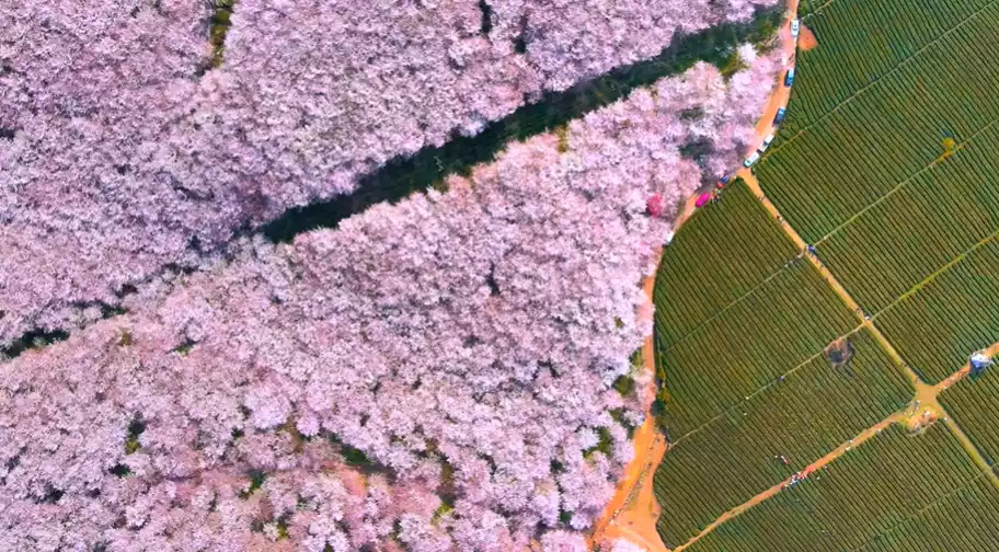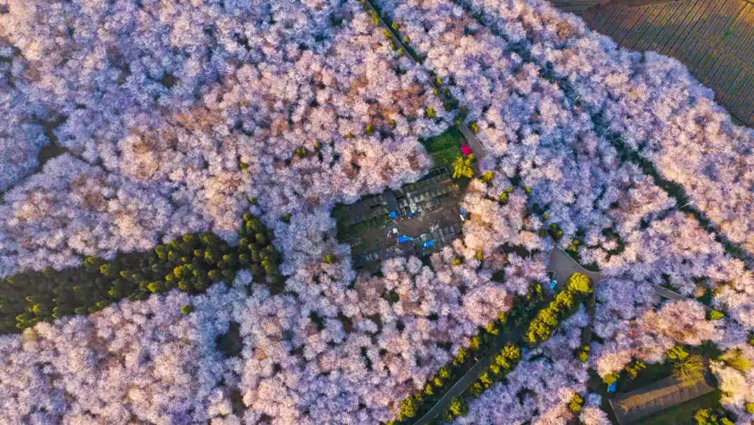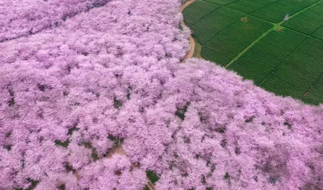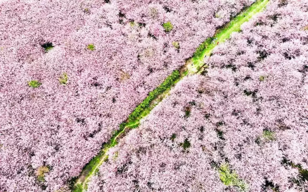 March here is a vibrant pink, a little-known phenomenon known as the "world's largest cherry blossom base." It surpasses Japan in both scale and variety, and its beauty goes without saying: the mountains are covered in endless pink and white blossoms.