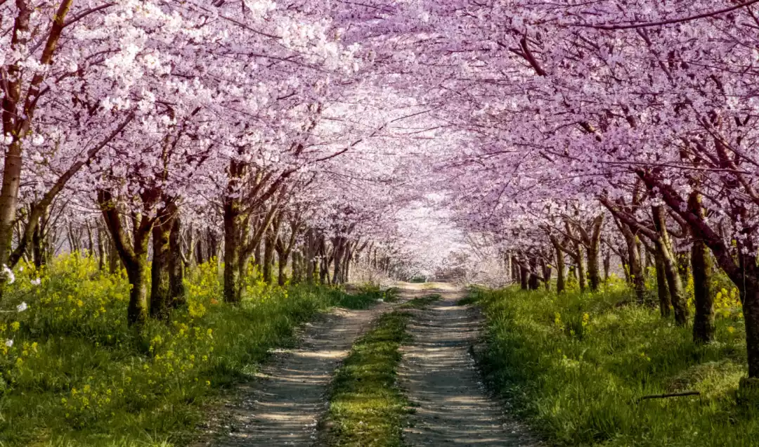 March here is colorful. You can see three kinds of flowers blooming at the same time - cherry blossoms, rape blossoms, and plum blossoms. Pink, white, and yellow fill the frame. At that time, the flowers bloom into a sea, which is both romantic and gentle.