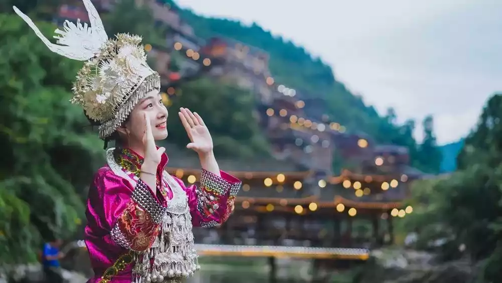 Every shot of the ancient village's attic is a surefire hit. At night, ascend the observation deck for a panoramic view and be captivated by the dazzling nightscape of the Xijiang River. Unlock a whole new way to experience the wonders of Miao cuisine with a long-table banquet featuring mountain and stream scenery.