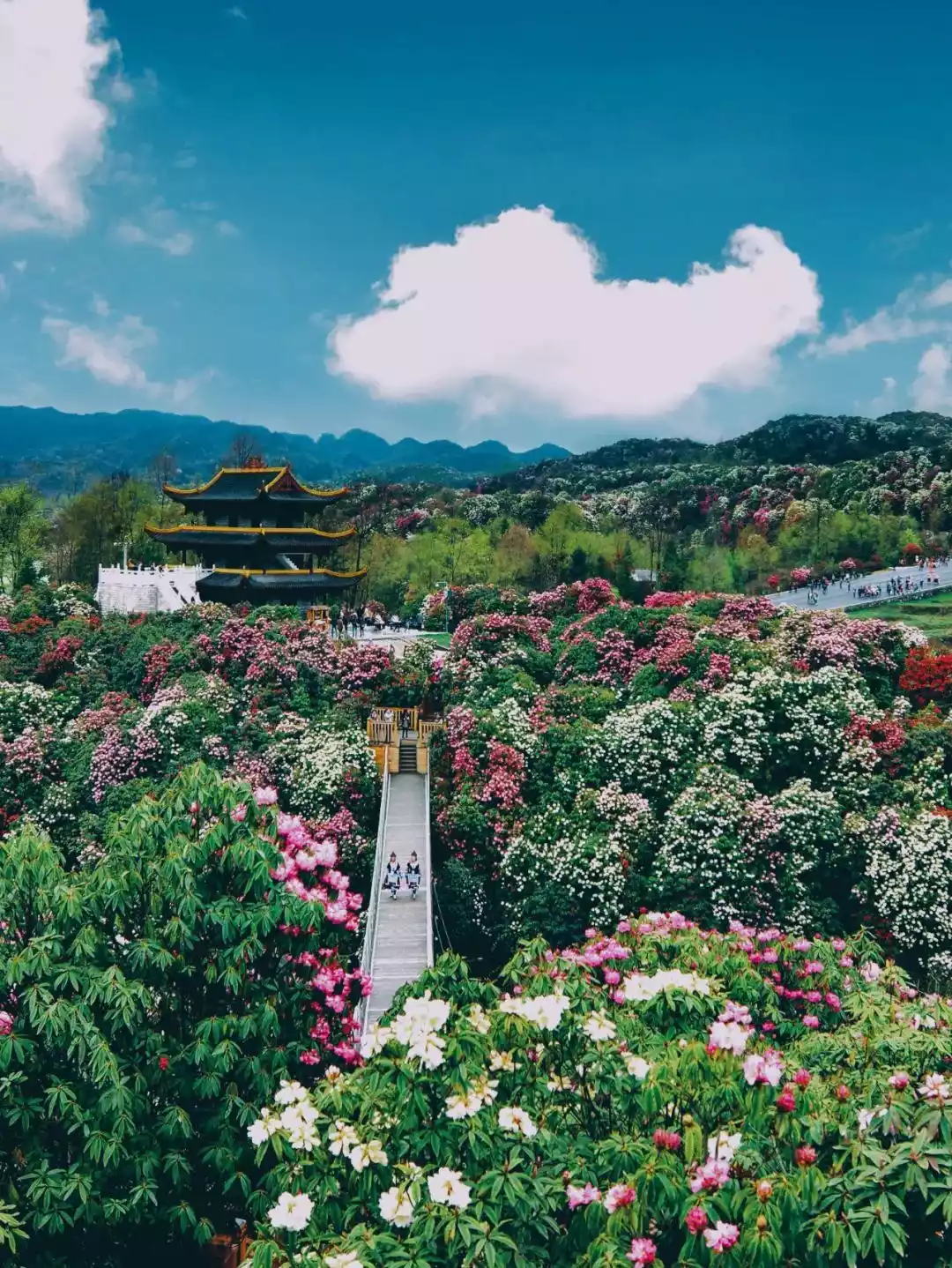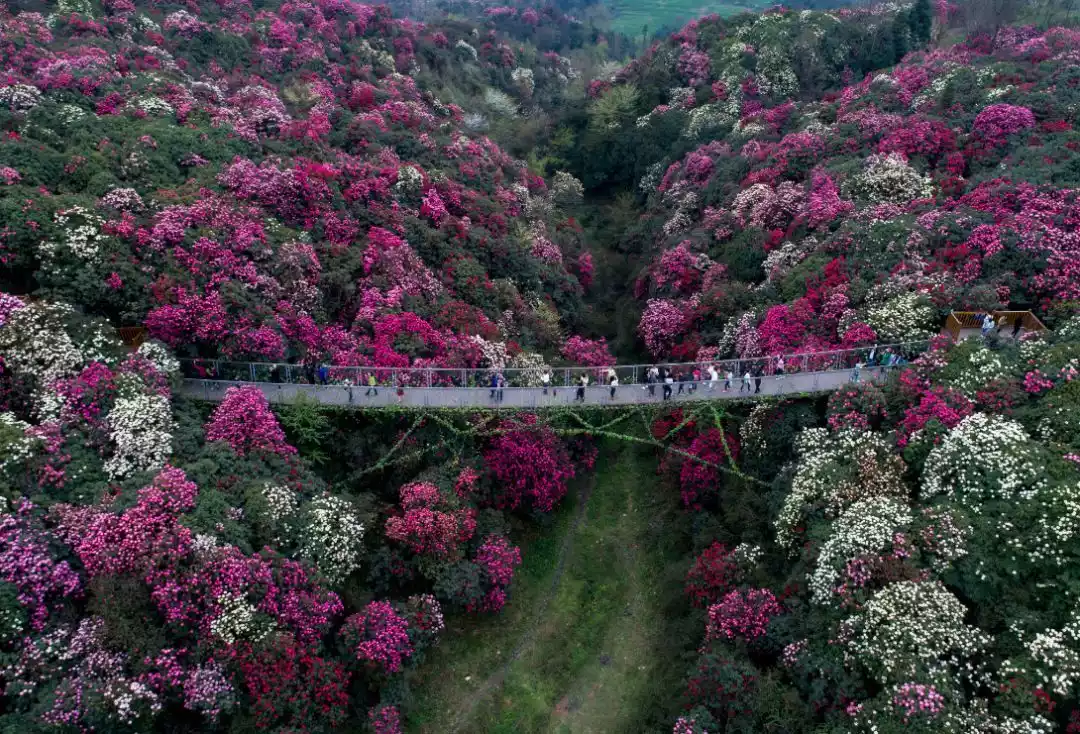 In late March, flowers of various colors bloom, and stepping into the flowers is like entering a fairy tale world, a beautiful picture of "thousands of peaks piled up, black gold buried underground; rhododendrons are like the sea, and the whole mountain is filled with strange fragrance."