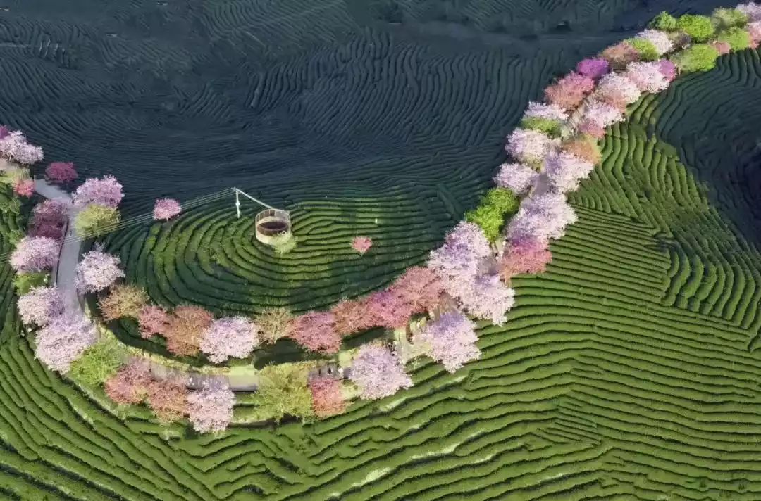Rows of cherry blossoms, radiating in color, are scattered among neat rows of dark green tea bushes. The red is tinged with pink, and the pink is tinged with a touch of purple. They are spread out in the tea garden in an orderly manner, blooming freely along the winding hillside, with distinct layers and a beautiful sight.