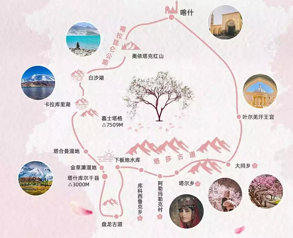 Villages with clusters of apricot blossoms, such as Datong, Tar, Qiaerlong, Kusinafu, and Kukoxiluk, are scattered along the Tashkurgan and Yarkand River valleys and are collectively known as apricot blossom villages. Due to differences in altitude and sunshine hours, the order of flowering varies from place to place.