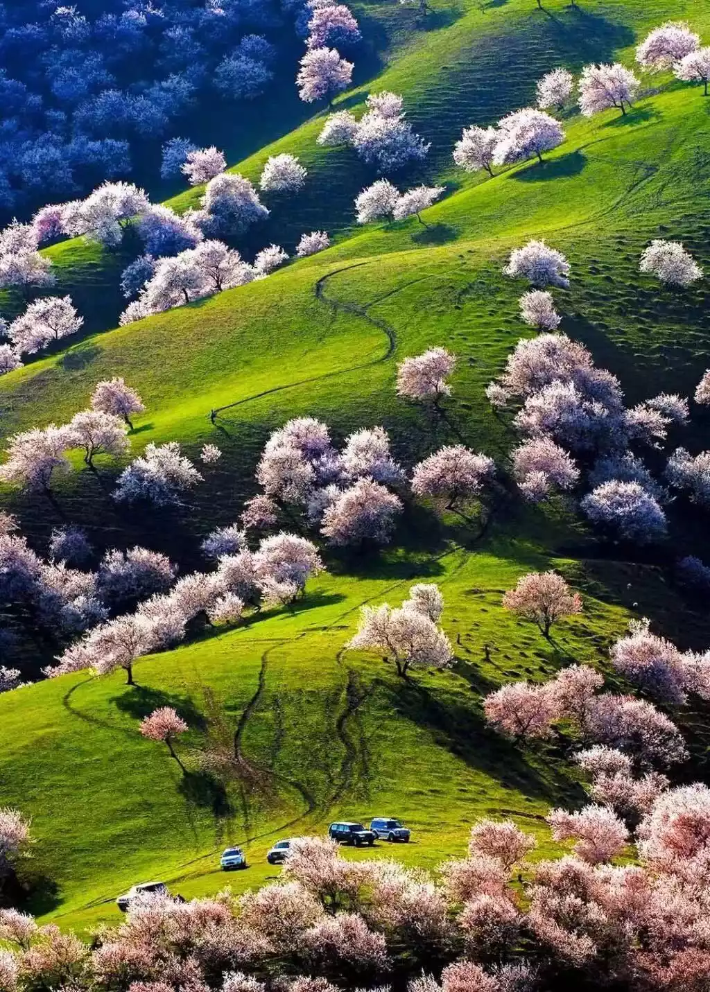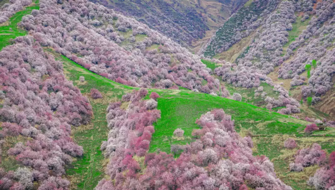 As the weather warms, the apricot blossoms elsewhere gradually fade, but in Kukesiruk Township, slightly higher up, they remain in full bloom. The densest concentration is in Alemaleke Village, where the entire village appears to have emerged from a sea of pink.