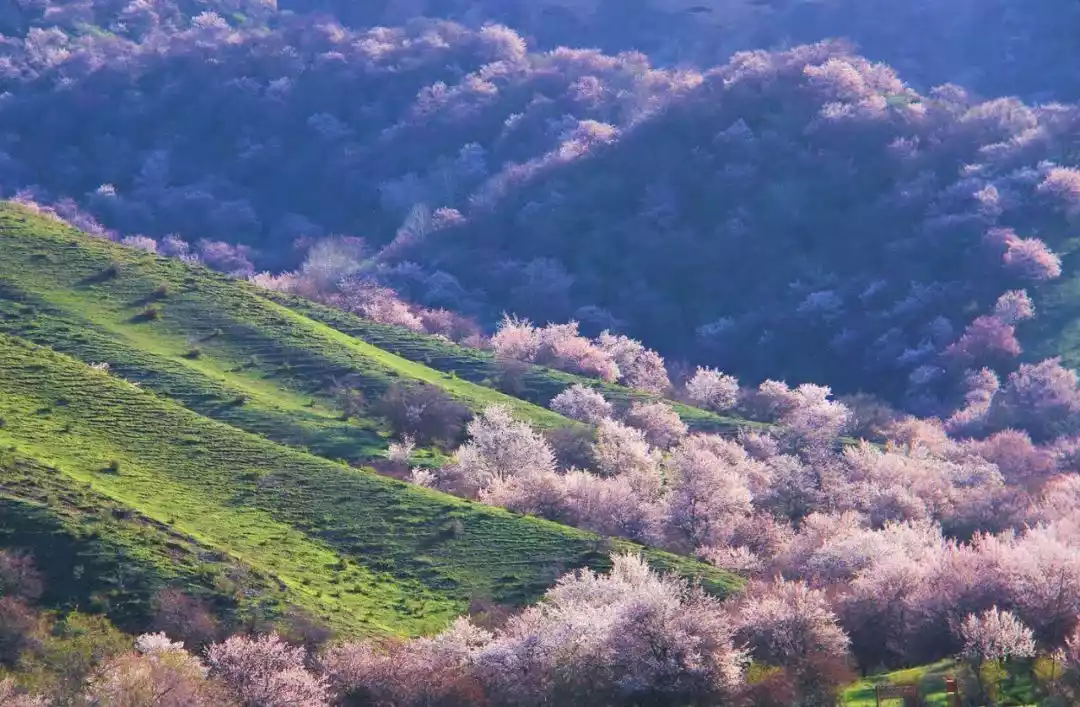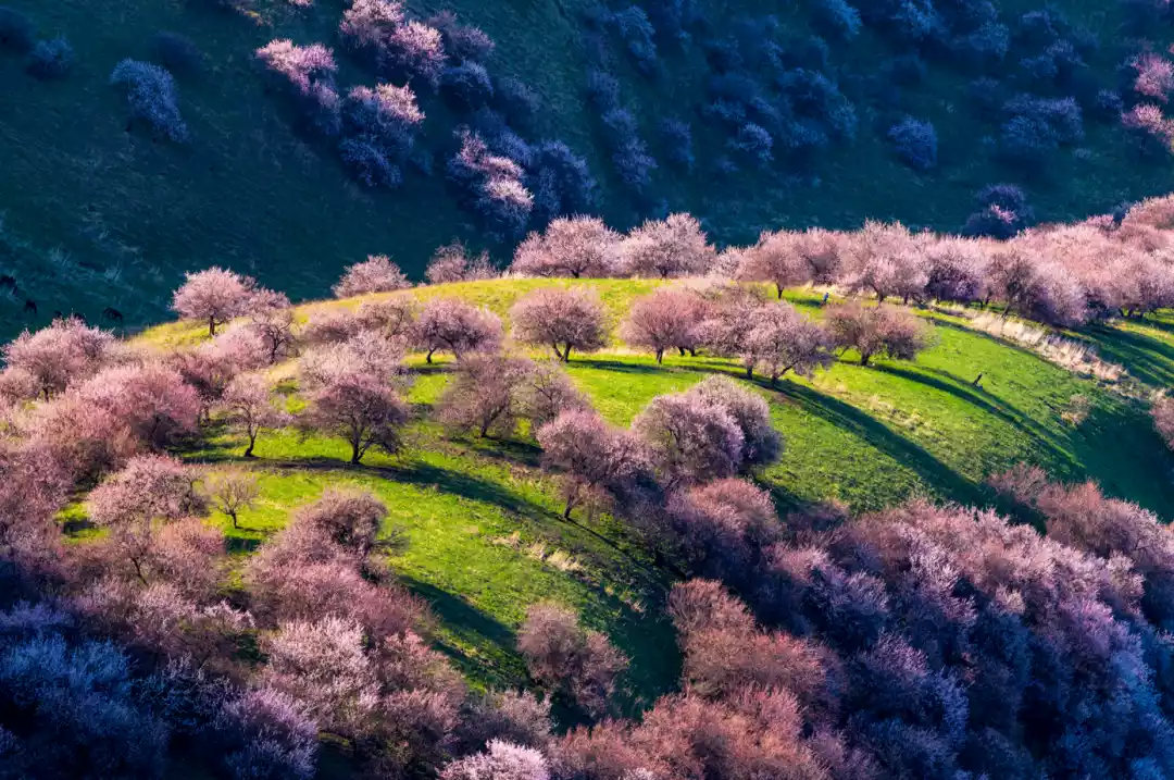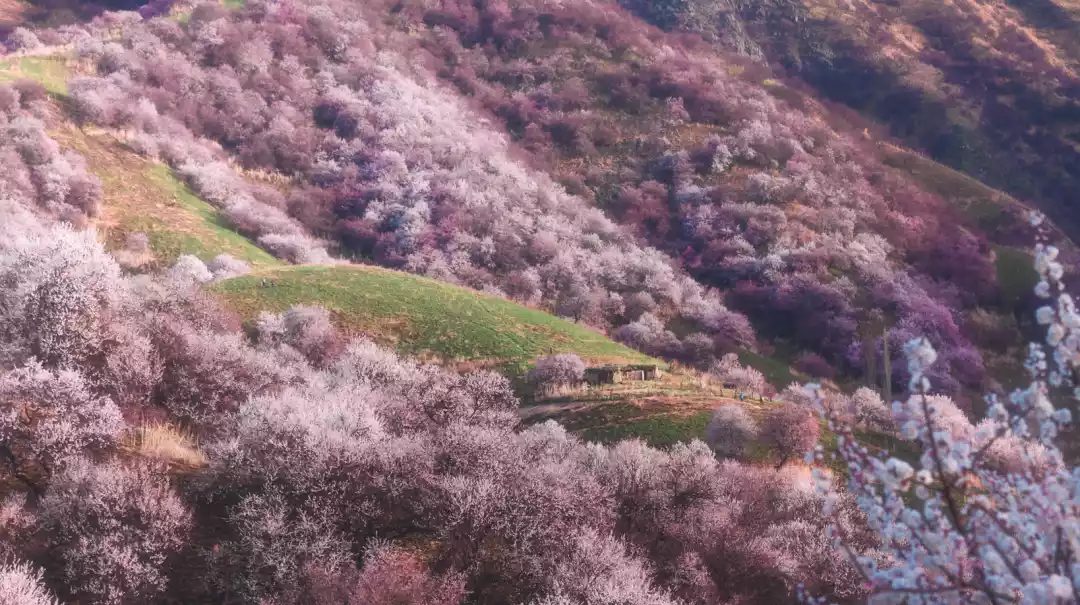 In the early morning, the sun rises slowly behind the hillside. The apricot blossoms in the sunlight are as charming as the rouge on a girl's cheeks. In the distance, there are snow-capped mountains, cattle and sheep, and herdsmen's small houses hidden in the apricot forest, perfectly presenting the charm of spring in Xinjiang!