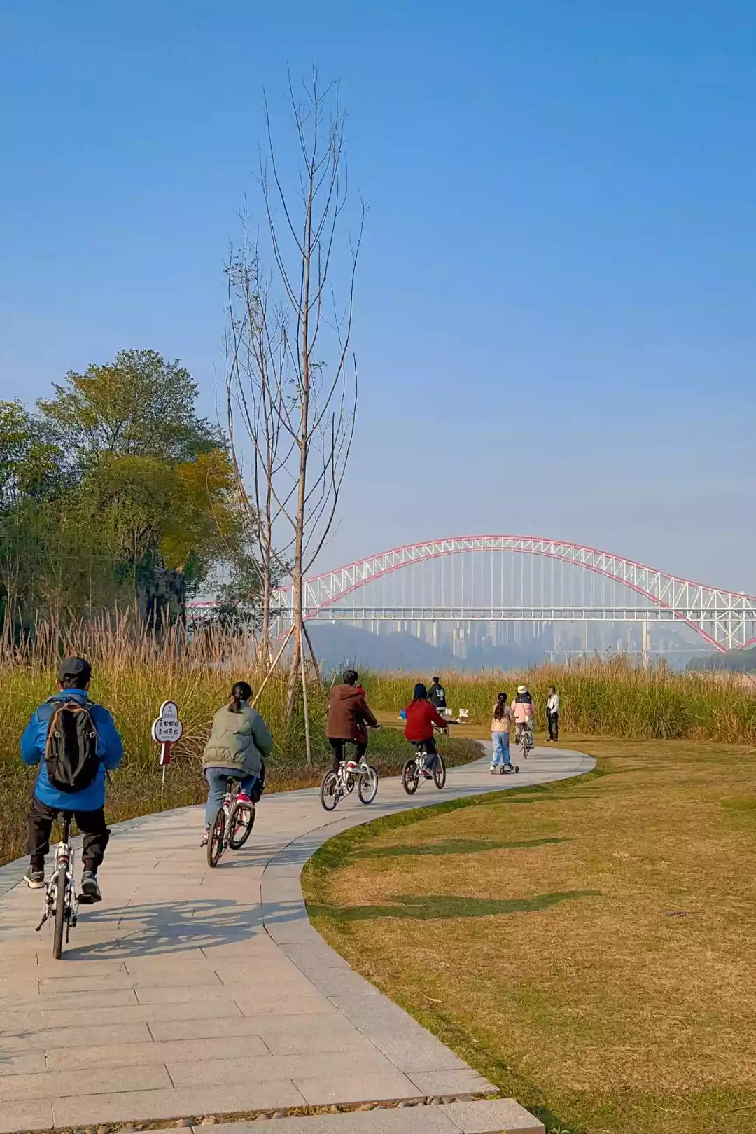 Cycling along the greenway by the Jialing River, you can check out the unique urban landscape of the mountain city along the way, take in the perfect camera position at the landmark Raffles, and the Jialing River Bridge will appear before your eyes one by one.