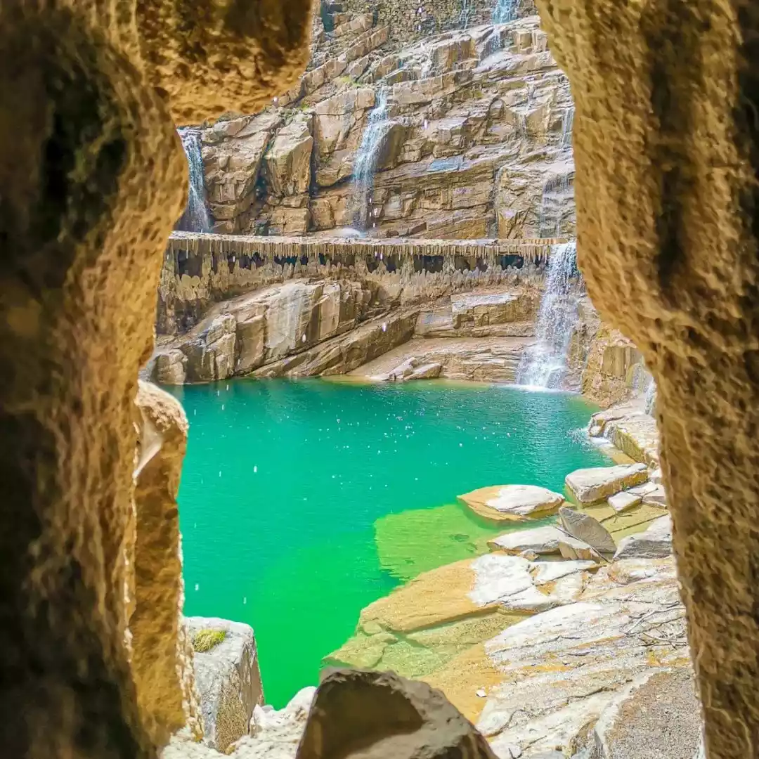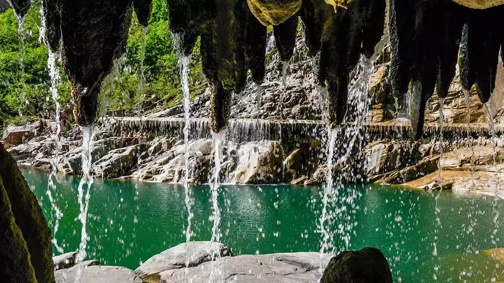 Below the waterfall is a clear blue pool. The mysterious Water Curtain Cave surrounds half of the pool at the bottom of the waterfall. Walking through it, you can see the waterfall singing, the water curtain like silk, and the flying pearls and splashing jade.