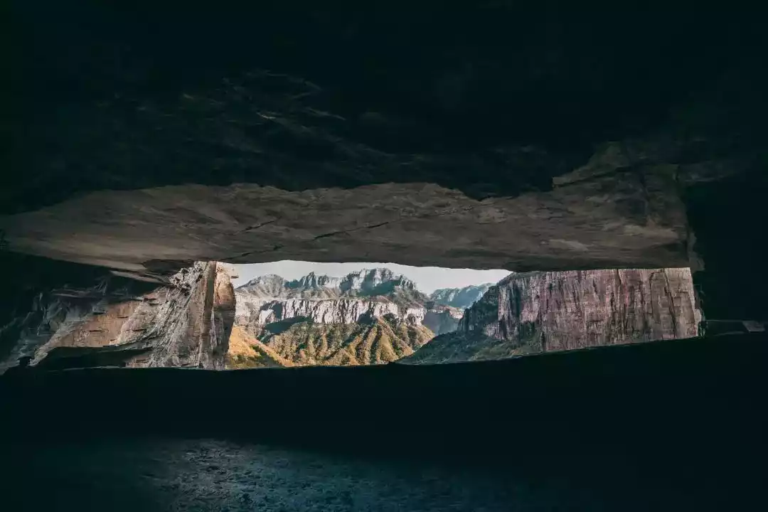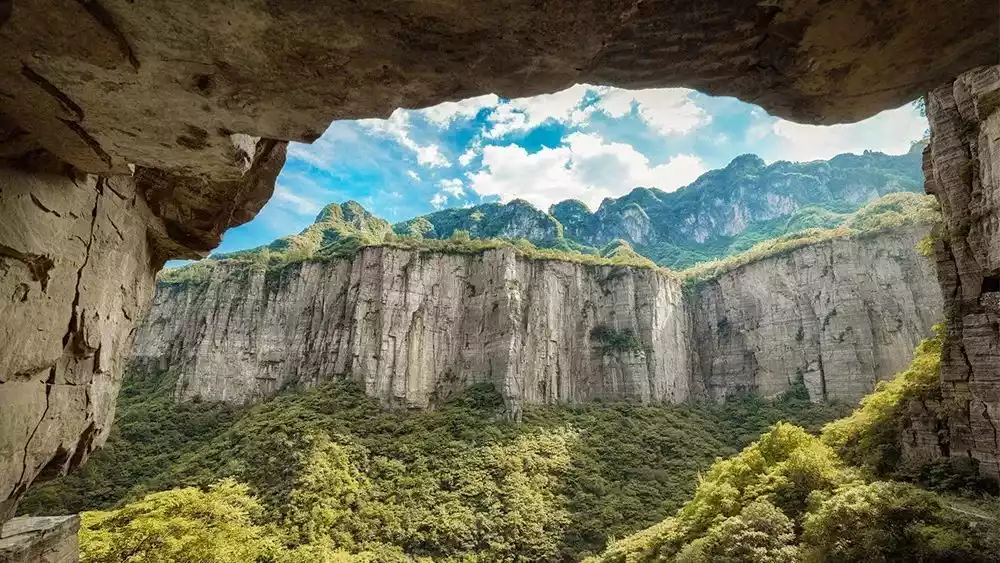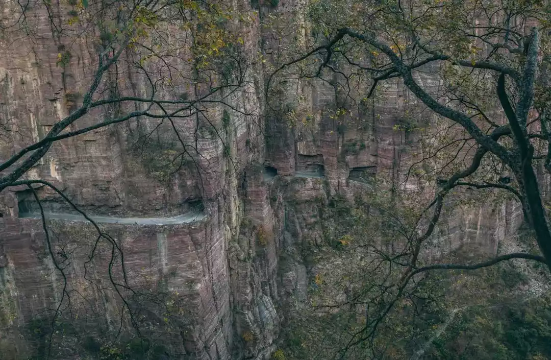 On the north side of the canyon lies Guoliang Cave, a cliff corridor. Looking south from the cave entrance, one can see the majestic cliffs, the smoke from the tiled houses on the cliffs, and the sturdy yellow elm trees on the cliff edge. From the south side of the canyon, one can see the 35 skylights of the cliff corridor and the majestic Guoliang Cave that stretches across the cliff.
