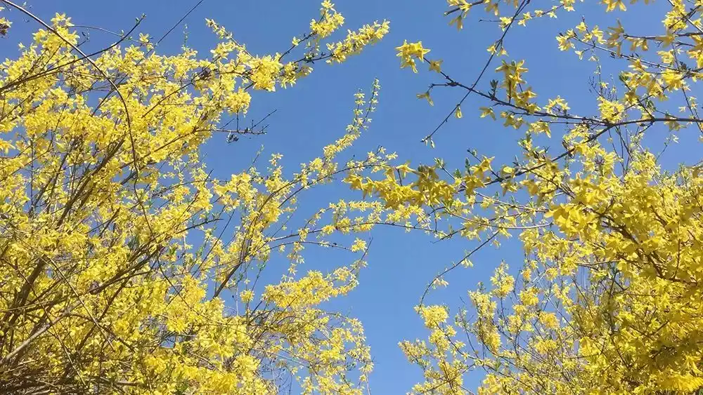 This place is also a famous Chinese medicinal material base with large areas of wild forsythia. Every spring, the mountains are covered with forsythia flowers in full bloom, like a golden ocean.
