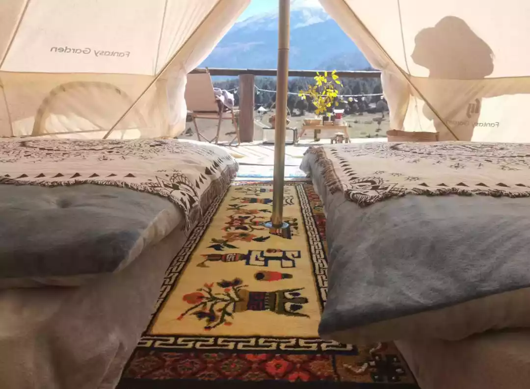 The campsite is equipped with pyramid or Indian double tents, 1.2 x 2m mattresses and quilts. In addition, electric blankets, hot water for washing, flush toilets, and recreational facilities are all available.