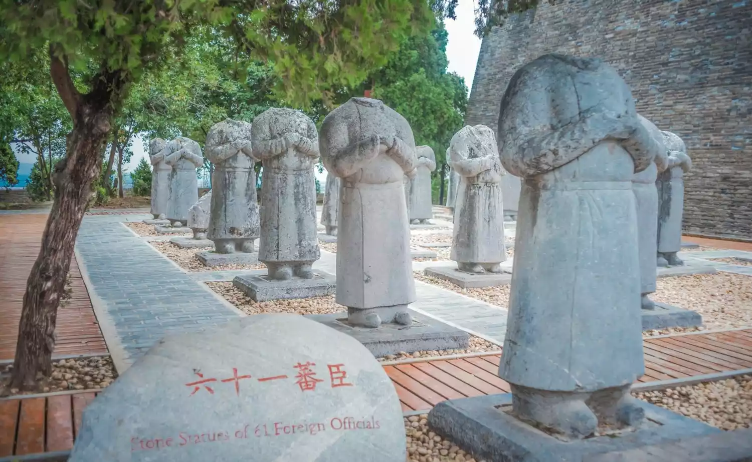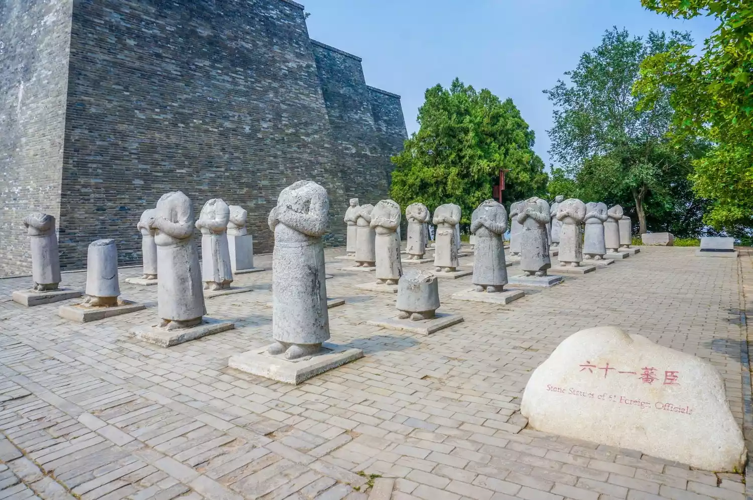 The "Sixty-One Foreign Ministers" statues have stood in front of Qianling Mausoleum for over 1,300 years. Each statue is dressed in a different manner, yet all stand respectfully with their hands cupped forward. Inscribed on the back of each statue are: Pei Yijianmisi, King of Shule; Ninieshishi, King of Kang; Yuchi Jing, King of Khotan; Peroz, King of Persia... ...