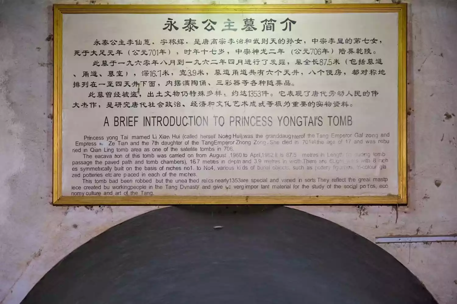 Princess Yongtai was the granddaughter of Emperor Gaozong of Tang, Li Zhi, and Empress Wu Zetian, and her tomb is one of the 17 accompanying tombs in Qianling Mausoleum.