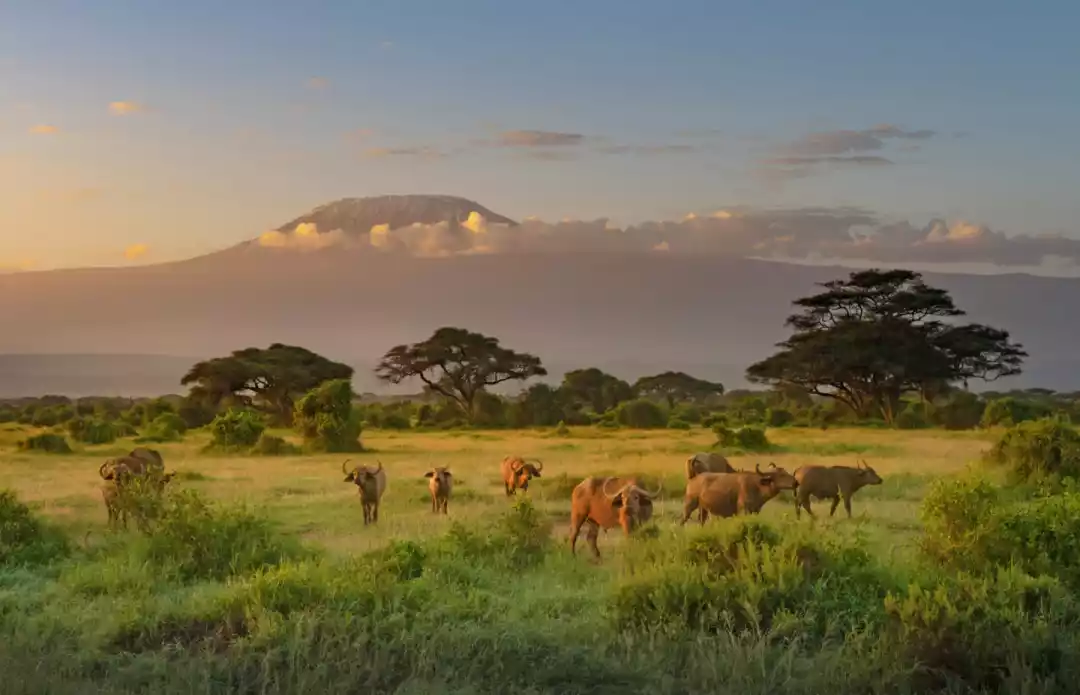 Mount Kilimanjaro, known as the "Roof of Africa" and the summit of Africa, is said to be melting in 10 years, marking the last snowfall at the equator. Although located in Tanzania, Amboseli offers the best vantage point. With a bit of luck, you can even capture the spectacular sight of a large herd of elephants passing by Mount Kilimanjaro at sunset.