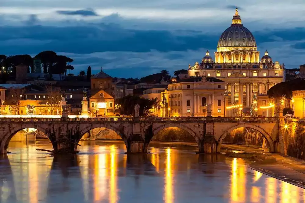 The sunset over the Tiber River, the bridge opposite is the Ponte Sant'Angelo. From this camera position, you can capture the Tiber River, the Ponte Sant'Angelo and the magnificent dome of St. Peter's Basilica at the same time.