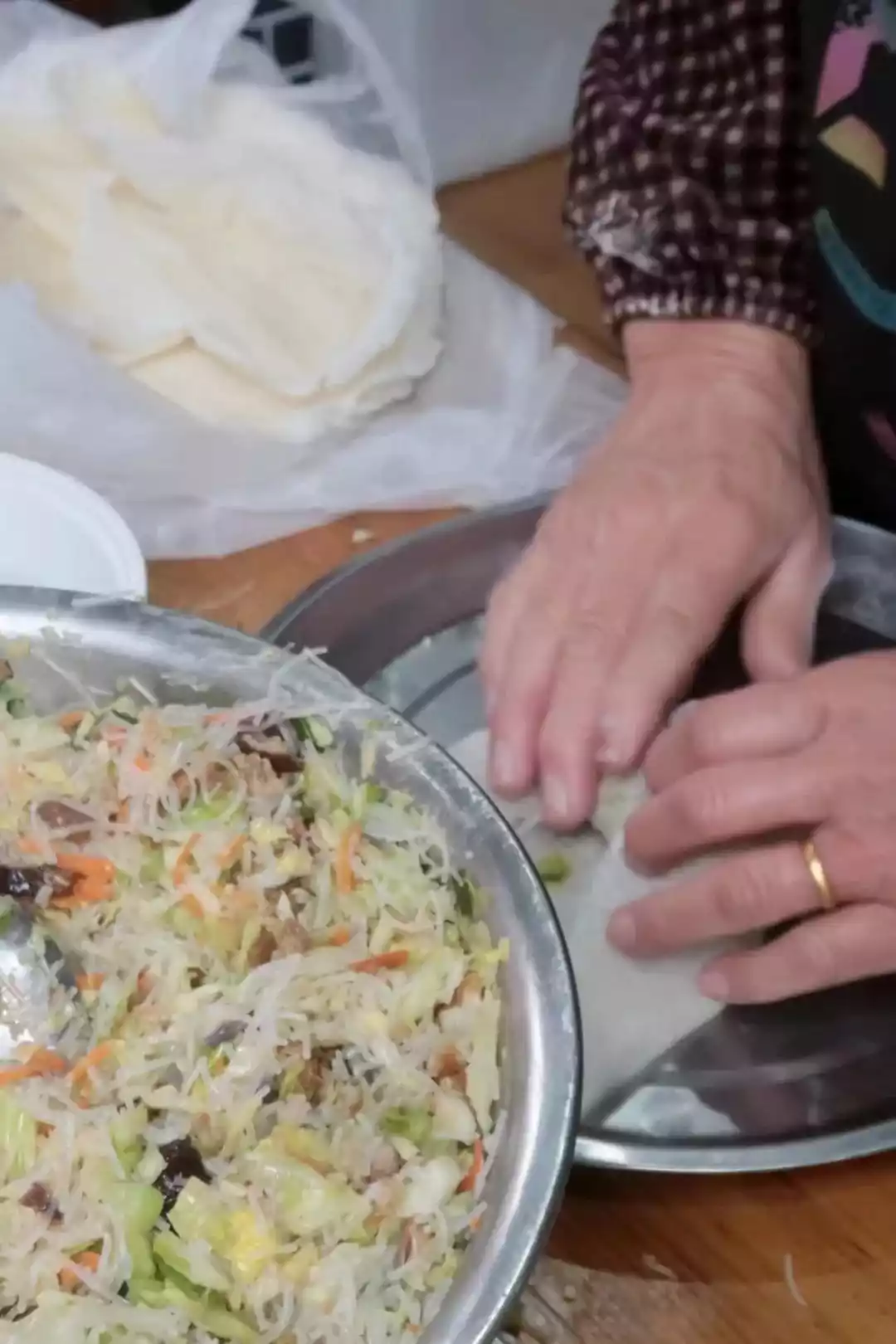 The soft, chewy spring roll wrappers are filled with carrots, leeks, vermicelli... Lard residue is added to enhance the aroma. After frying, the rolls are wrapped in the wrappers, and the vegetables are crispy and oily.