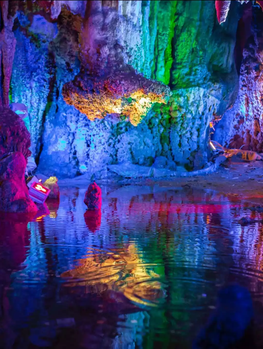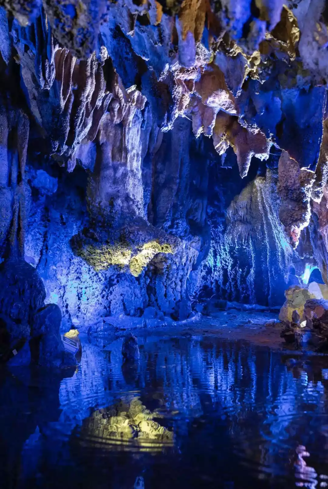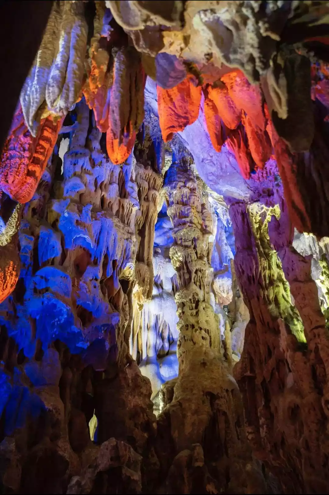 There are many stalagmites in the cave with various shapes. Looking up, you can see the river full of stalactites; looking down at the water, you can see the colorful stone forest reflected in it; when sailing through the water, you can touch the smooth jade-like stone buds with your hands.
