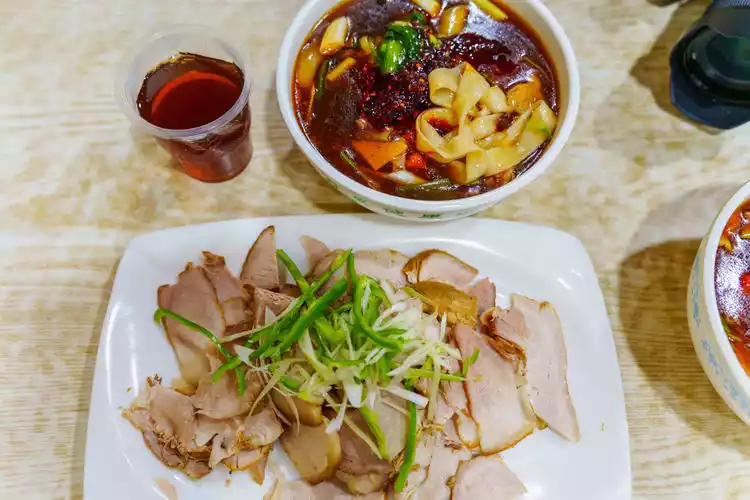 Wuwei cuisine is all about the number three, with dishes like Sandaoche (Three-Tao Cart) and Sanpaotai (Three-Paotai)—both names are straightforward. The name "Santaoche" (Three-Tao Cart) originates from General Zuo Zongtang and consists of Liangzhou noodles, braised pork, and rock sugar Fucha tea, with unlimited refills. Sanpaotai (Three-Paotai) can be customized to your taste, combining the aroma of tea with the sweetness of jujube, longan, and rock sugar, to help reduce greasiness and reduce greasiness.
