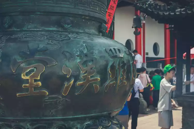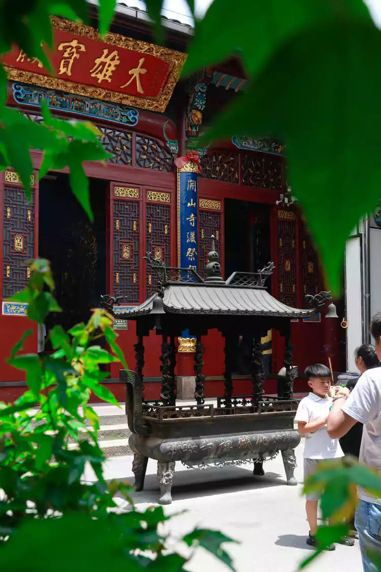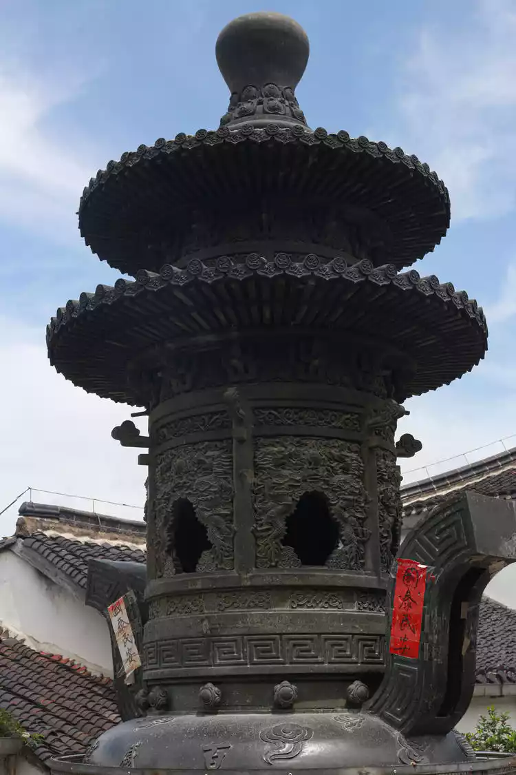 There's a saying at Huacheng Temple: "Enter and worship Maitreya, and exit and worship Skanda." Huacheng Temple houses and displays over 1,800 cultural relics, including the "Avatamsaka Sutra," which took 28 years to complete, fulfilling the wish of Zen Master Wu Sui at the age of 100, and the imperial calligraphy of Emperors Kangxi and Qianlong of the Qing Dynasty. The above picture shows a Qing Dynasty stone incense burner with the character for "longevity" carved into it.