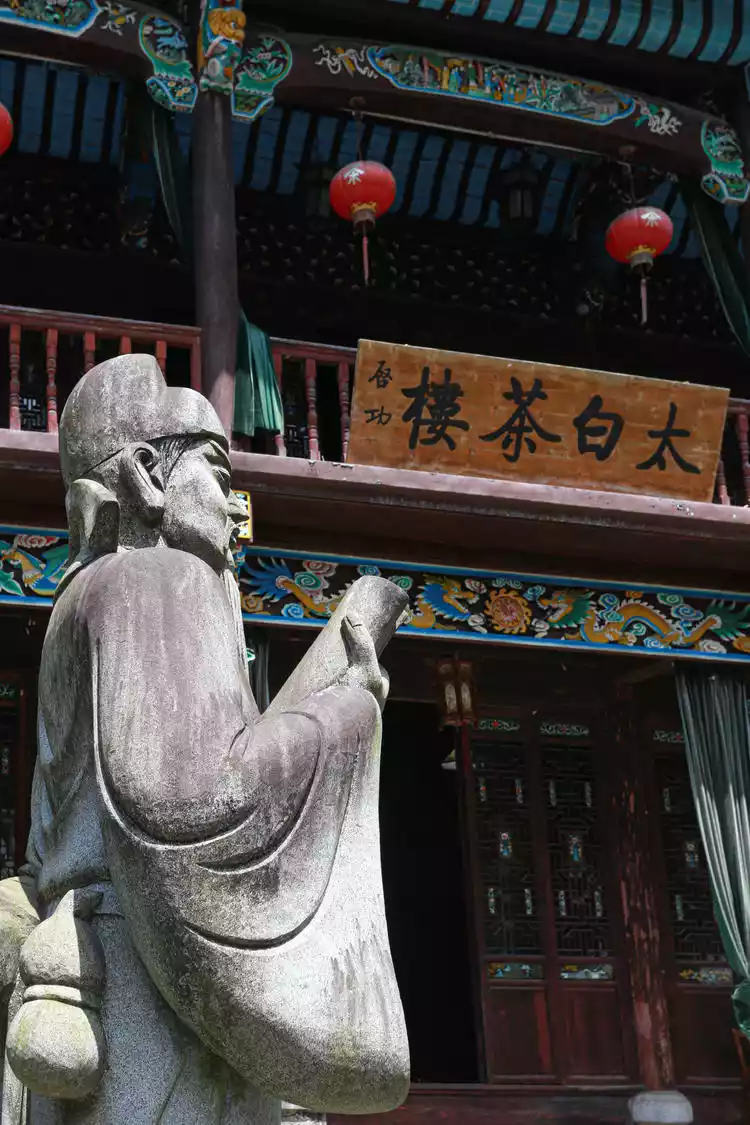 Just a few minutes' walk from Huacheng Temple leads to Jiuhua Old Street. Nestled alongside the street is Taibai Academy, where Li Bai lived in seclusion in 755 AD. Later, in the early Jiaxi reign of the Southern Song Dynasty (circa 1237 AD), Qingyang County Magistrate Cai Yuanlong renovated the academy to commemorate Li Bai's second visit to Jiuhua. Li Bai left many famous poems here, the most familiar of which is "Wonderful existence of two energies, sacred mountain opens Jiuhua."