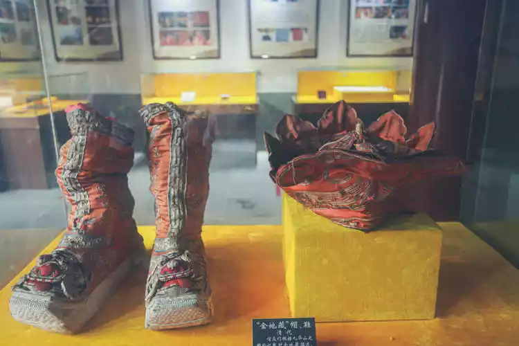 According to legend, Ksitigarbha Bodhisattva was in Jiuhua Mountain and chanted scriptures on the rooftop every morning, leaving footprints on the ground. Later, believers embroidered monk hats and shoes with tiger heads and tiger stripes based on the records of Jiuhua Mountain and the description of Ksitigarbha, and enshrined them in Huacheng Temple.