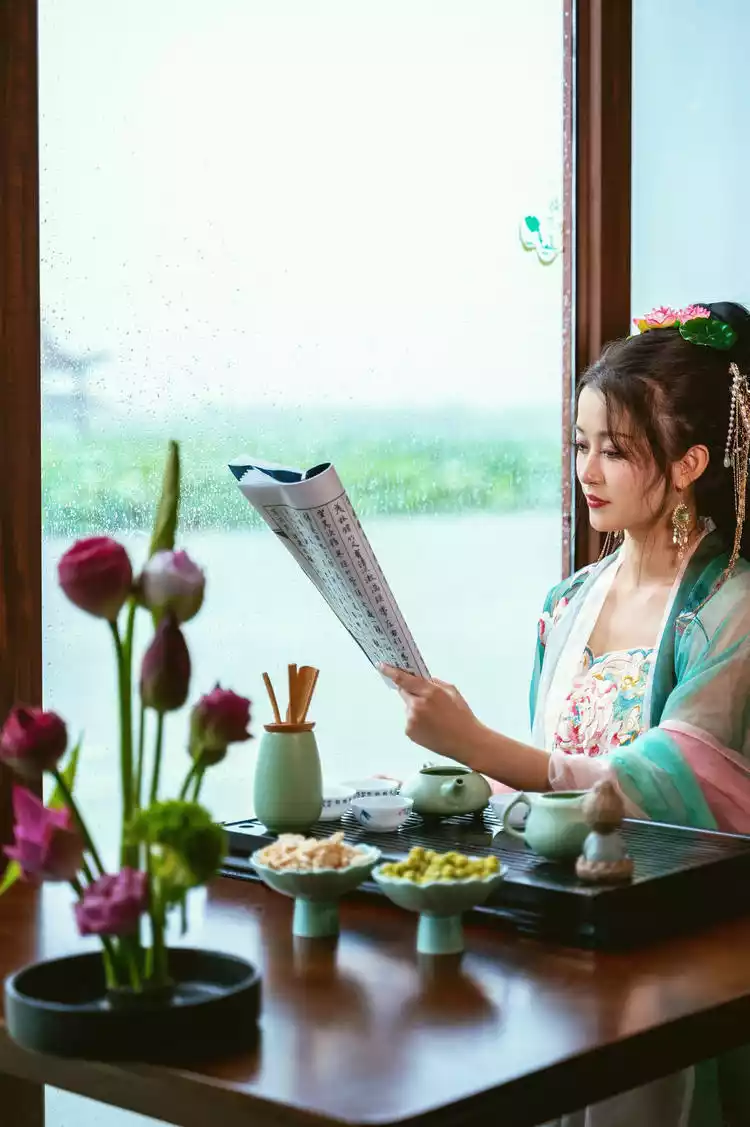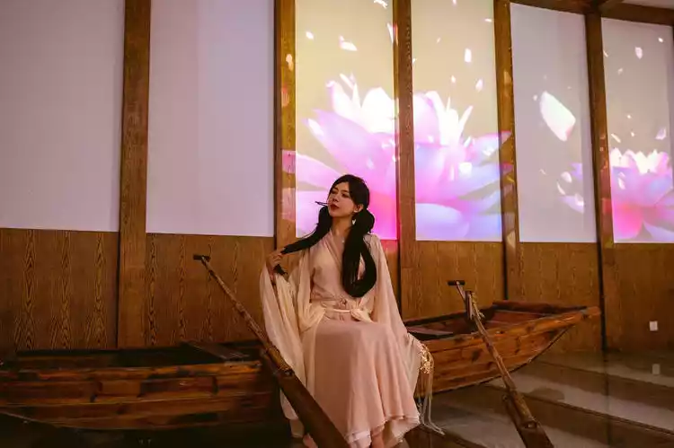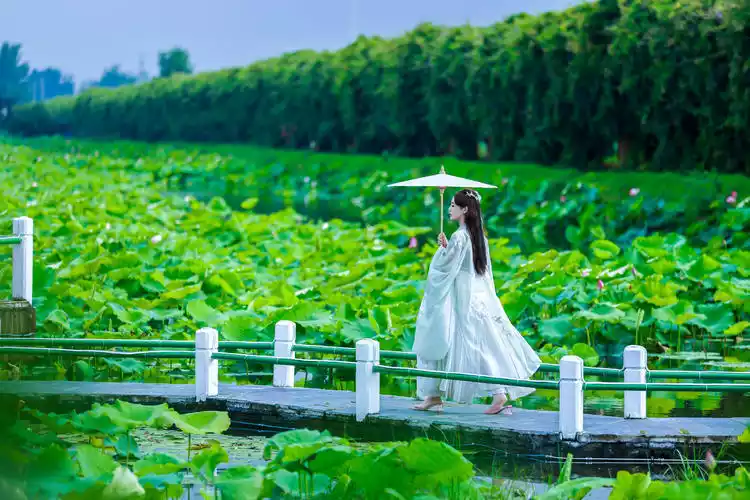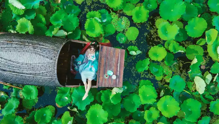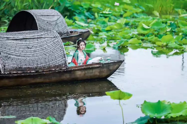 I was boating on the water and accidentally wandered into the depths of lotus flowers. The scene I had always imagined was now right in front of me: the clear water was covered with dense clusters of huge lotus leaves, a black-sailed boat, and an elegant woman in ancient costume, who had lost her way in the depths of the lotus leaves. Such a scene was truly amazing.