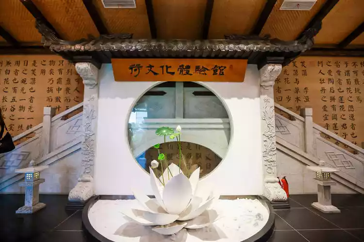 Not far from the statue of the Lotus Fairy, there is a small house. This is the Lotus Culture Experience Hall. With ten thousand acres of lotus pond as the background, it is the first lotus-themed comprehensive exhibition hall in Jiangsu Province. It is divided into six theme exhibition areas: "Sequence", "View", "Knowledge", "Enlightenment", "Inheritance" and "Realm".