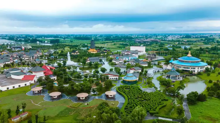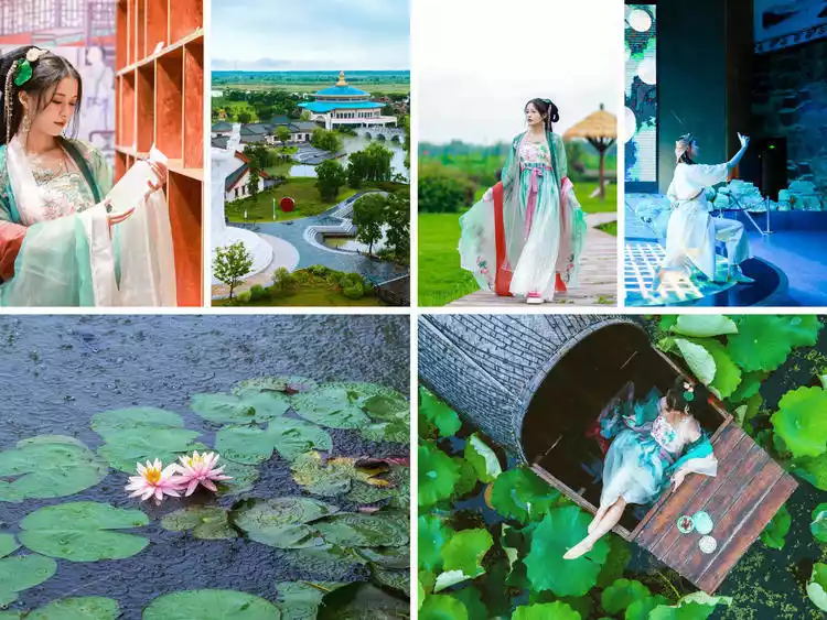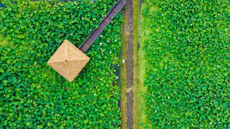 Looking down from the air at Lotus Pond, one feels a sense of breathtaking beauty, as if "the lotus leaves stretch to the sky, the lotus blossoms are a striking red in the sunlight." The scenic area boasts attractions such as Lotus Fairy Square, Wisteria Corridor, Hundred Lotus Garden, Bihe Pavilion, and Watery Years. Lotus Fairy Square and Hundred Lotus Garden are the highlights, especially in summer, offering excellent opportunities for lotus viewing, whether by boating in the pond or simply admiring the scene from the shore.