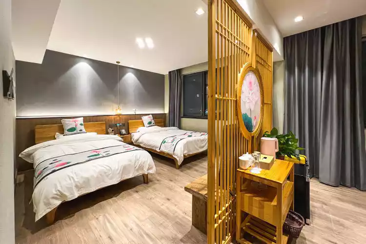 Whenever I visit Jinhu, I usually stay in Heyun Town. The neat rows of two-story villas, paired with exquisite courtyards, make this place look very livable. The pink walls and black tiles of the houses complement the lotus leaves that cover the water, embodying the charm of the Jiangnan region. The Ouyu Boutique B&B in the town is a popular choice. This unique B&B, themed around lotus culture, offers comfortable accommodations, comprehensive facilities, and a beautiful environment, all within easy reach of Jinhu's popular attractions.