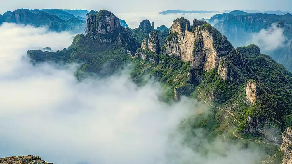 Wangmangling is the most dangerous section of the fault zone connecting the Loess Plateau and the Zhongzhou Plain. Due to the dramatic elevation difference, a sea of clouds appears after heavy rain or snow, which occurs approximately 100 days a year. These clouds surge through the peaks and valleys, sometimes resembling a rushing river, a waterfall, a vast lake, or even the surging sea. The clouds rise and fall, and the peaks appear and disappear in a myriad of forms, creating a scene resembling a fairyland.