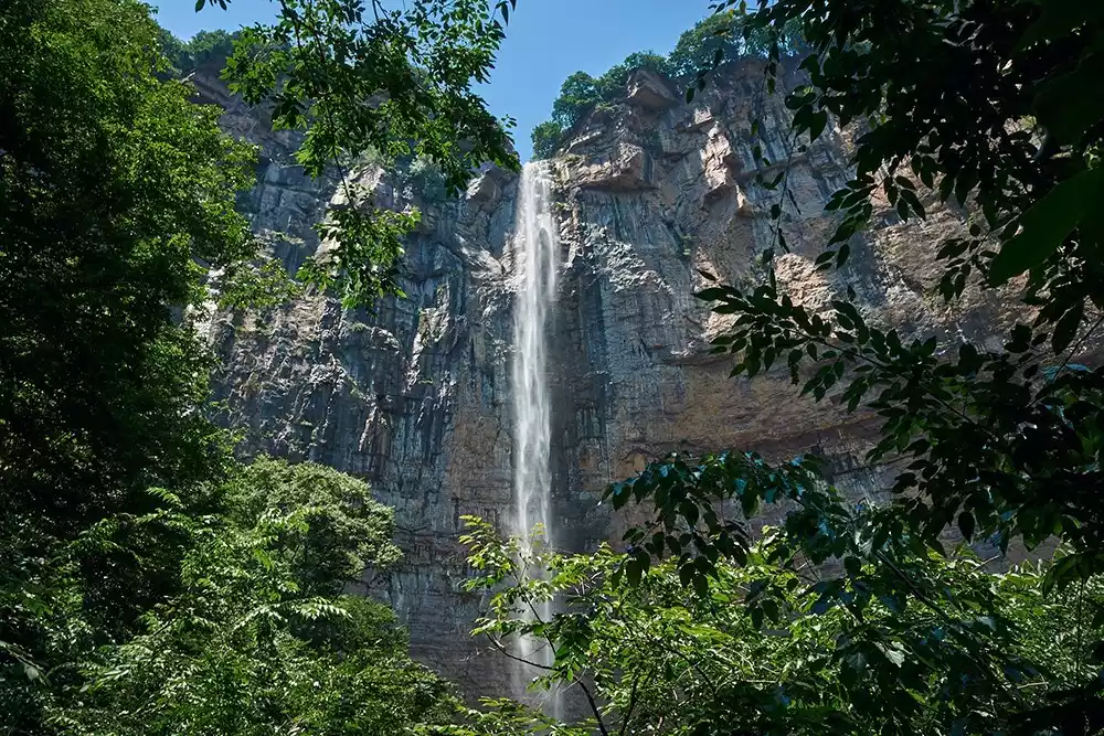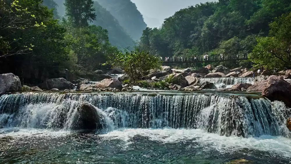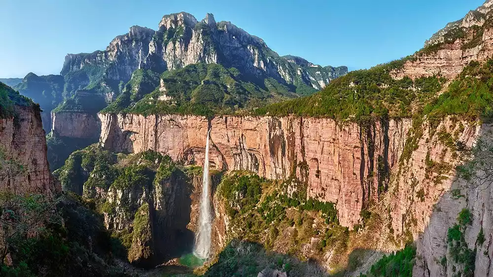 Tianhe Waterfall, with a drop of over 180 meters, is the highest waterfall in North China. It's also a landmark in the southern Taihang Mountains. Beneath the waterfall lies a shimmering emerald lake, and a mysterious water curtain cave surrounds half of the lake's base. Walking through it, you'll witness the cascading waterfall, the flowing water curtain, and the cascading pearls and jade.