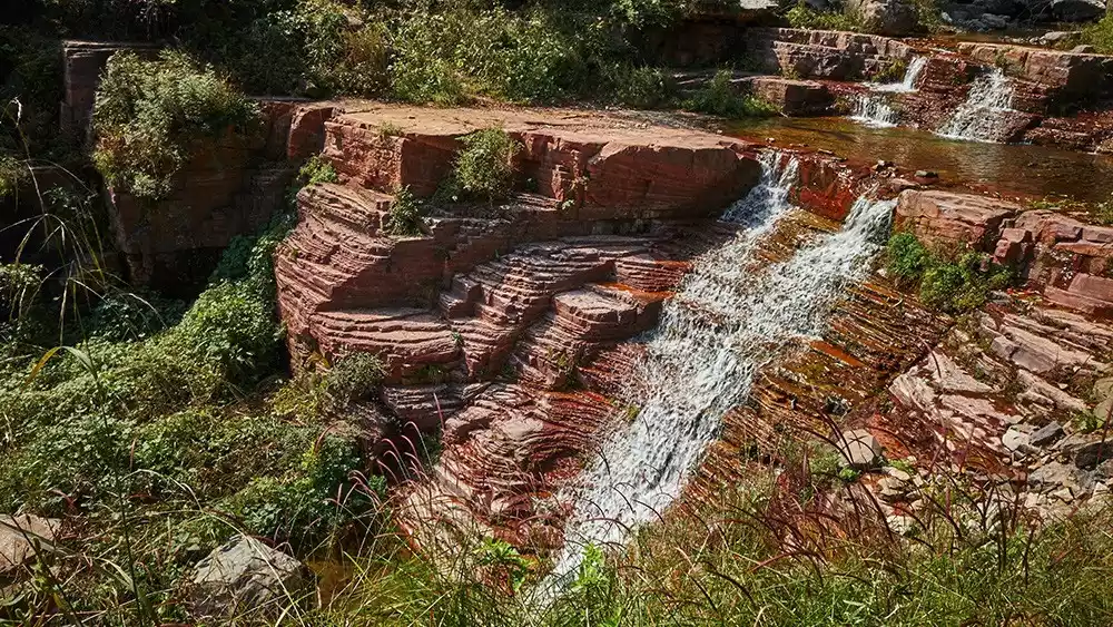Baodu Village, the only village in Shanxi Province without road access, lies at the end of the Baodugou Grand Canyon. Not far from the village entrance is Laolongkou, a famous checkpoint in the southern Taihang Mountains. River water carves deep grooves into the rocks, creating a unique landscape with smooth, germanium-red cross-sections that is breathtakingly beautiful and awe-inspiring. During the flood season, the majestic Longsui Waterfall, with a drop of over 300 meters, is a truly breathtaking sight.