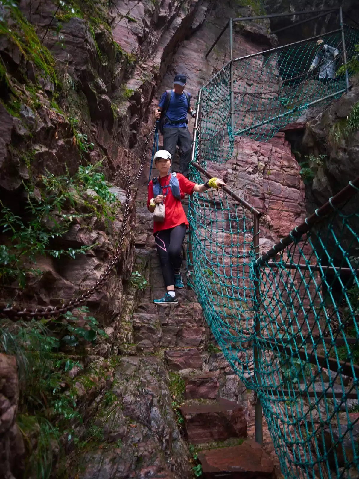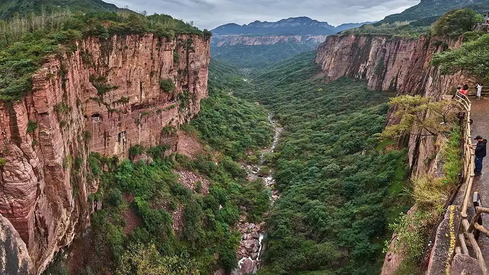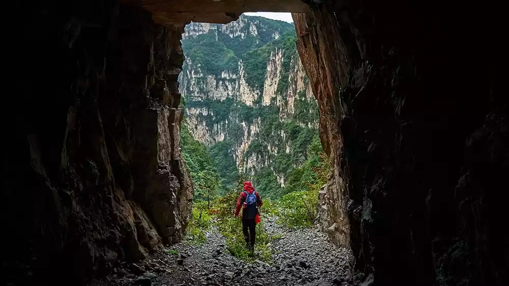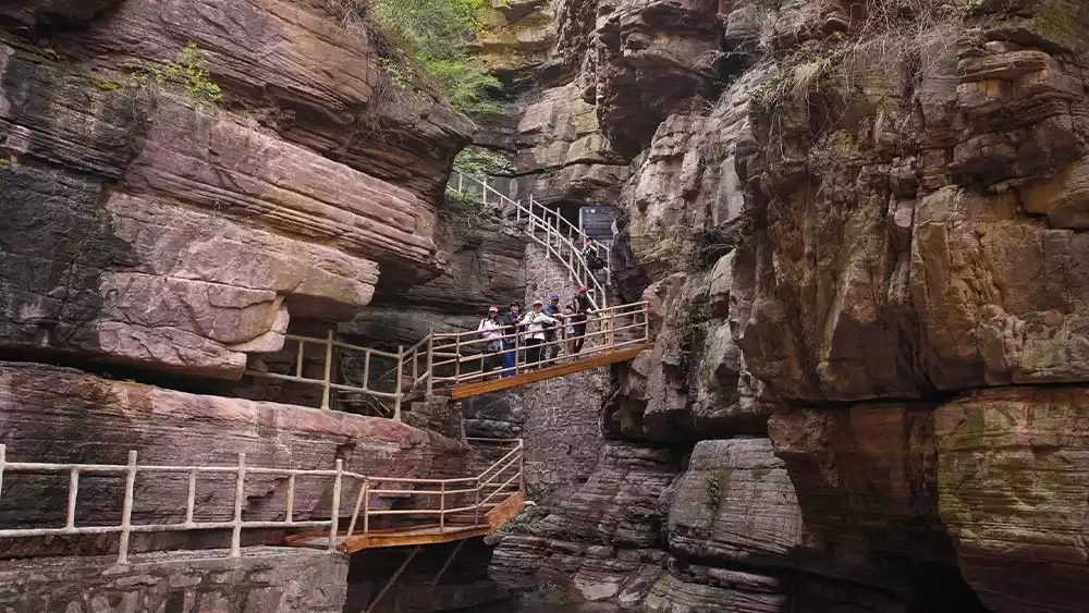From Guoliang Village, take a scenic shuttle bus to Nanping, then transfer to a sightseeing bus to reach Danfengou, a hidden ravine nestled among the cliffs. Here, towering red rock cliffs rise up to a thousand-foot cliff on one end and a towering stone wall on the other. Legend has it that Taishang Laojun cultivated elixirs here and distributed them to the immortals. Within, waterfalls and springs flow, and a winding plank road carved into the cliff leads directly to the valley floor.