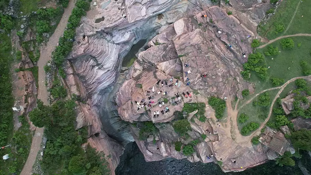 The South Taihang Mountains, shaped by the sedimentation of the East-West Fault Zone, have a jagged terrain with precipitous cliffs and sheer cliffs, forming numerous canyons and cliffs. Coupled with the abundant rainfall of the entire Taihang Mountains, the region, saturated by rain, is a scene where water meets sky, and pools and waterfalls connect. This creates a breathtaking display of verdant mountains, clear waters, crimson cliffs, and seas of clouds, a scene rarely seen in northern China. It resembles a fairyland, a painting.