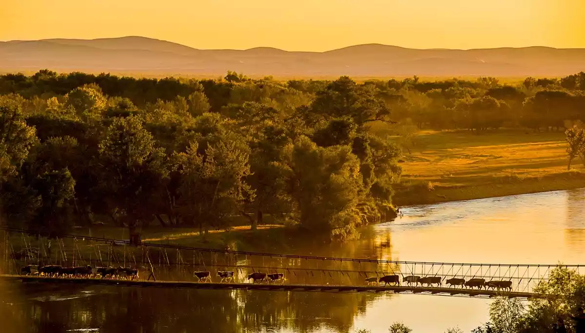 Erdao Bridge is full of primitive charm, with a wide waterway and the clear autumn water reflecting the golden poplars. It is also set against the backdrop of yurts and rolling sand dunes. It is the best spot to take pictures of reflections, sunsets and night scenes.