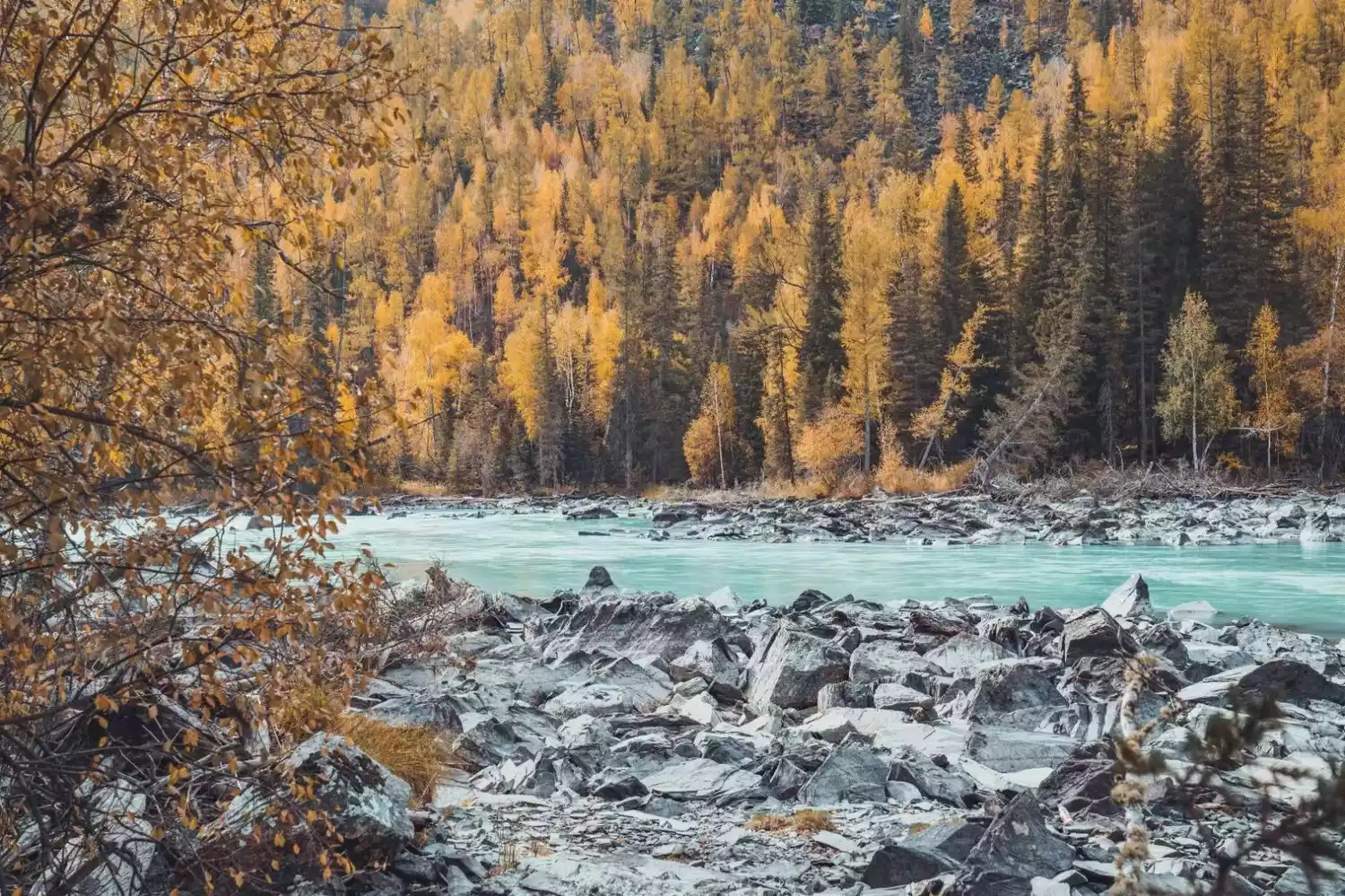 In autumn, Wucai Beach, known as the best beach in the world, is adjacent to the rippling Irtysh River. It is rocky but barren, and contrasts beautifully with the lush and green river valley on the opposite bank.