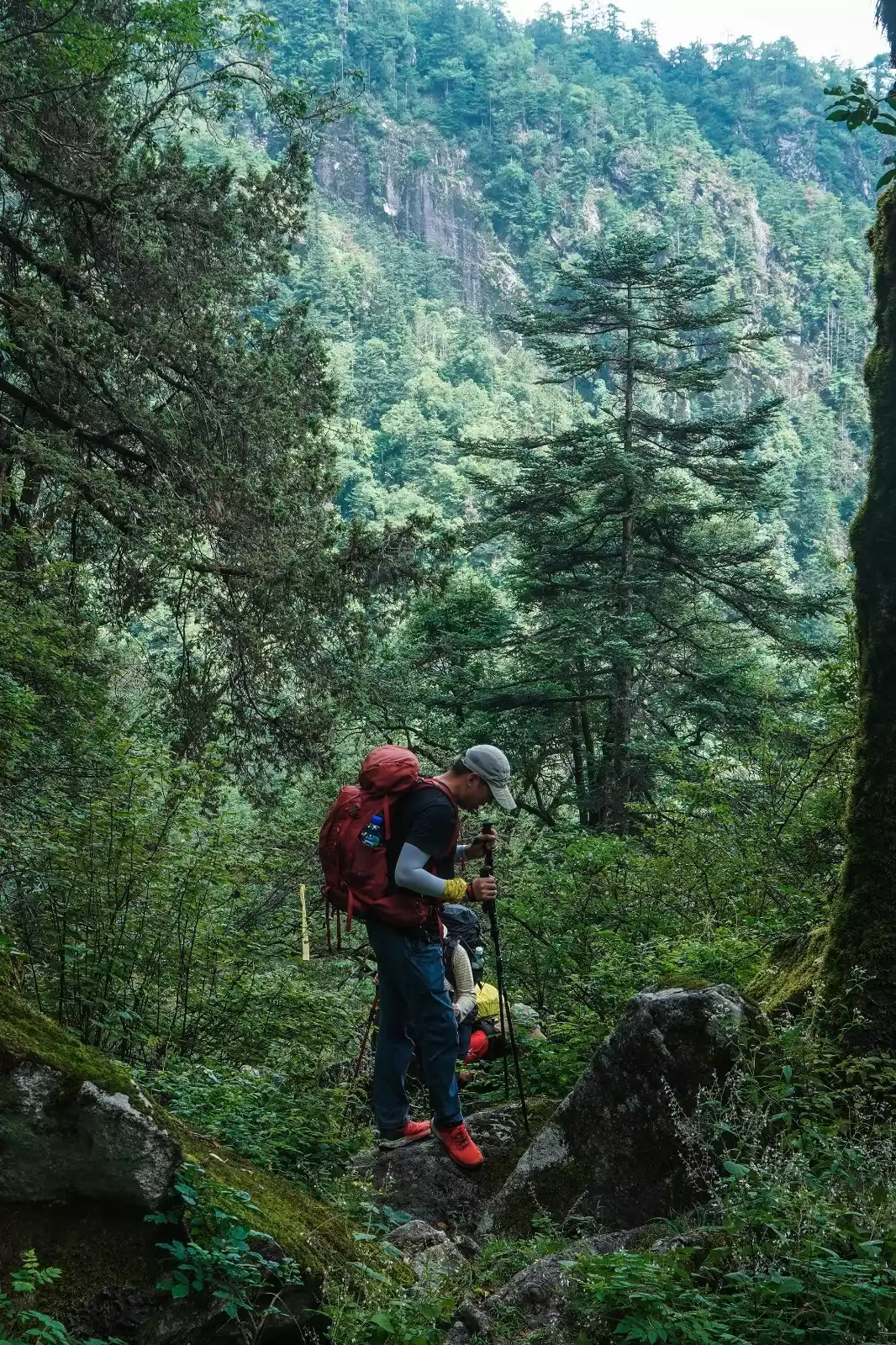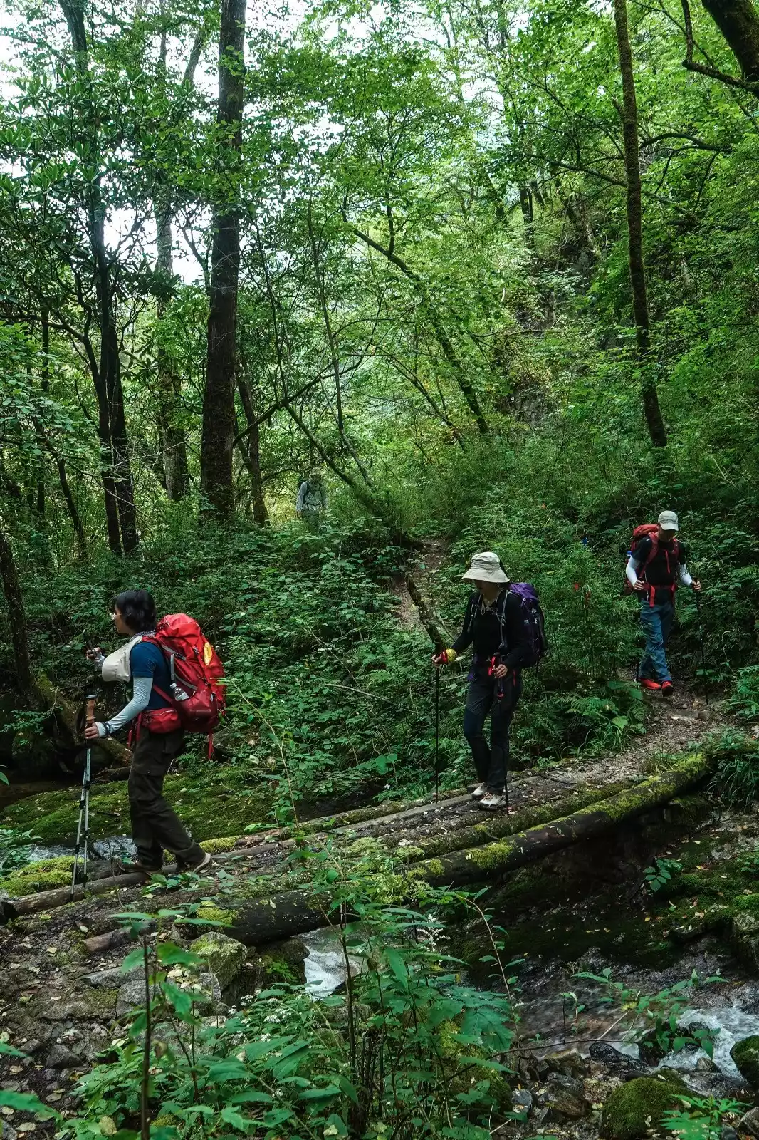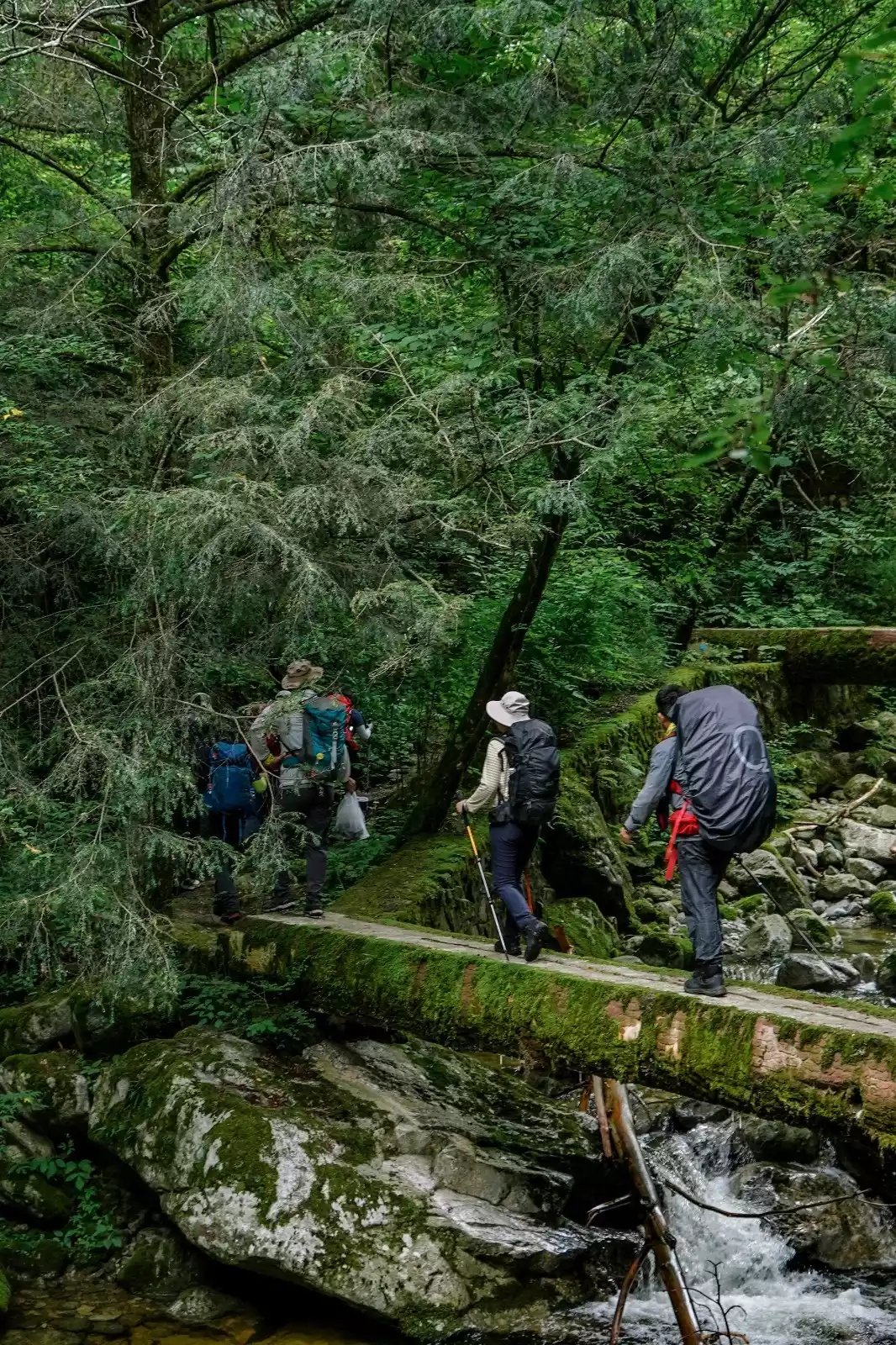 After about 2 hours and climbing about 100 meters, we arrived at Sanhegong Waterfall. There were virgin forests all along the way, with green vines hanging and moss covering the rocks. The meltwater originating from the Taibai Mountain roared and flowed down the valley, forming clear pools and waterfalls along the way. It is worthy of being the south slope of Taibai Mountain, which is already the south in the geographical sense, and it feels a bit like a southern rainforest!